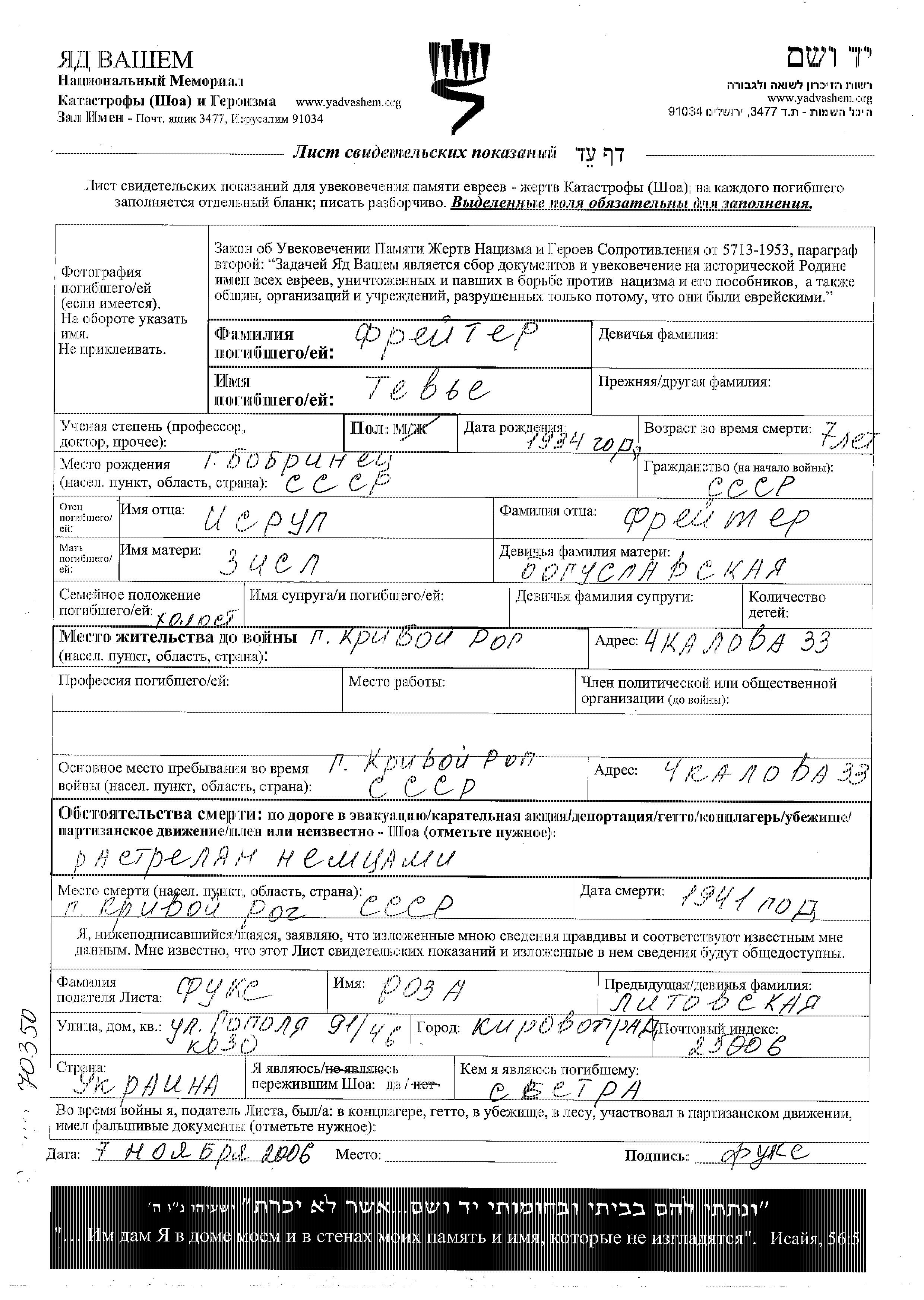 Teviye Freyter wurde im Jahr 1934 in Bobrinets, Ukraine (UdSSR) geboren. Er war der Sohn von Isrul und Zisl, geb. Boguslavskaya. Er war Kind. Vor dem Zweiten Weltkrieg lebte er in Bobrinets, Ukraine (UdSSR). Während des Krieges war er in Bobrinets, Ukraine (UdSSR).