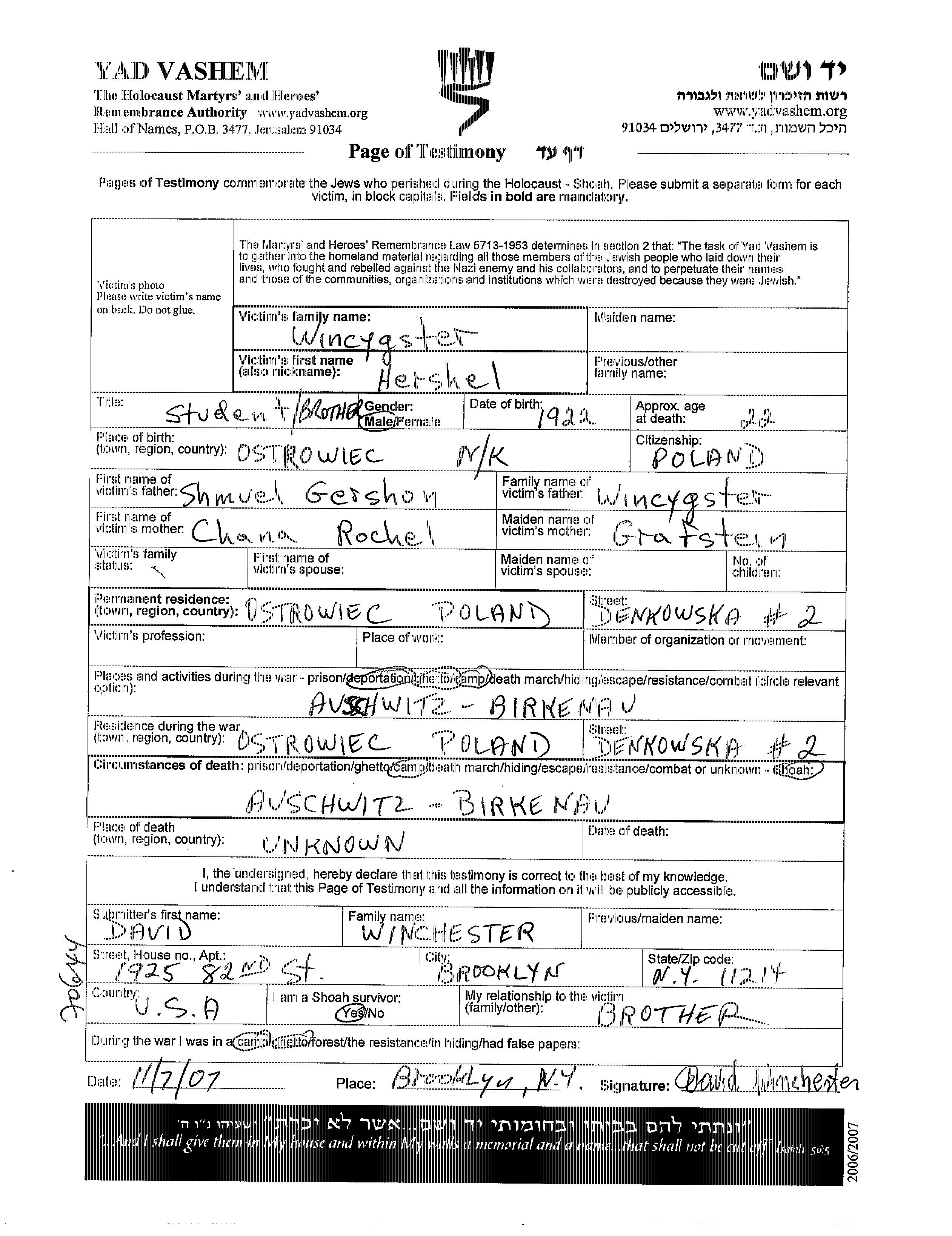 Hershel Wincygster wurde im Jahr 1922 in Ostrowiec, Polen geboren. Er war der Sohn von Shmuel Gershon und Chana Rochel, geb. Grafstein. Er war Student. Vor dem Zweiten Weltkrieg lebte er in Ostrowiec, Polen. Während des Krieges war er in Ostrowiec, Polen.