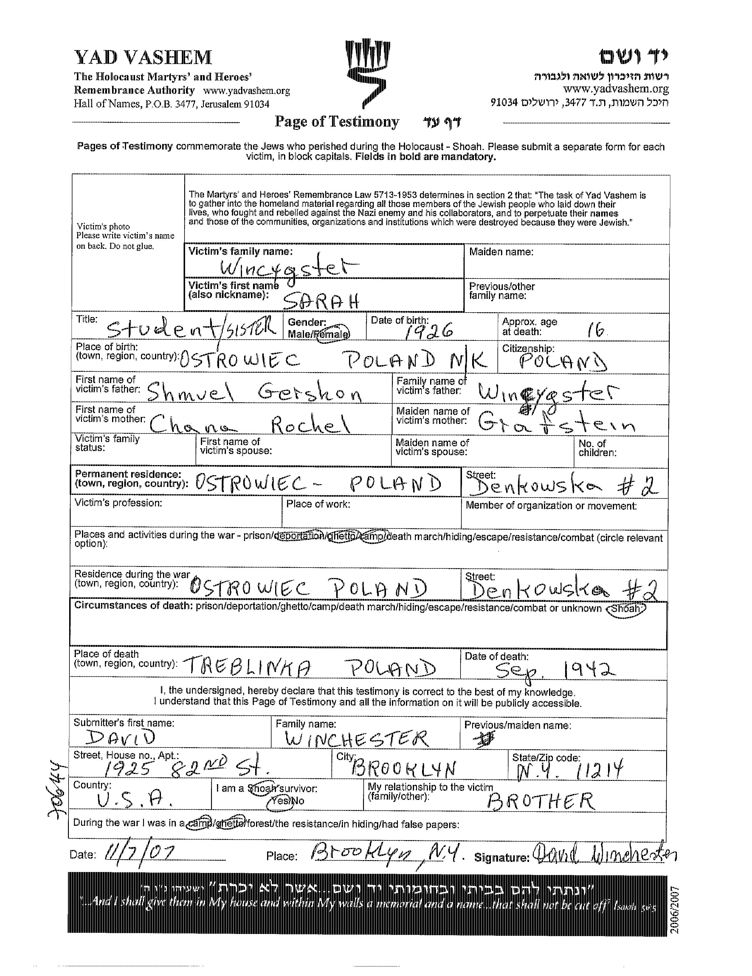 Sarah Wincygster wurde im Jahr 1926 in Ostrowiec, Polen geboren. Sie war die Tochter von Shmuel Gershon und Chana Rochel, geb. Grafstein. Sie war Student. Vor dem Zweiten Weltkrieg lebte sie in Ostrowiec, Polen. Während des Krieges war sie in Ostrowiec, Polen.
