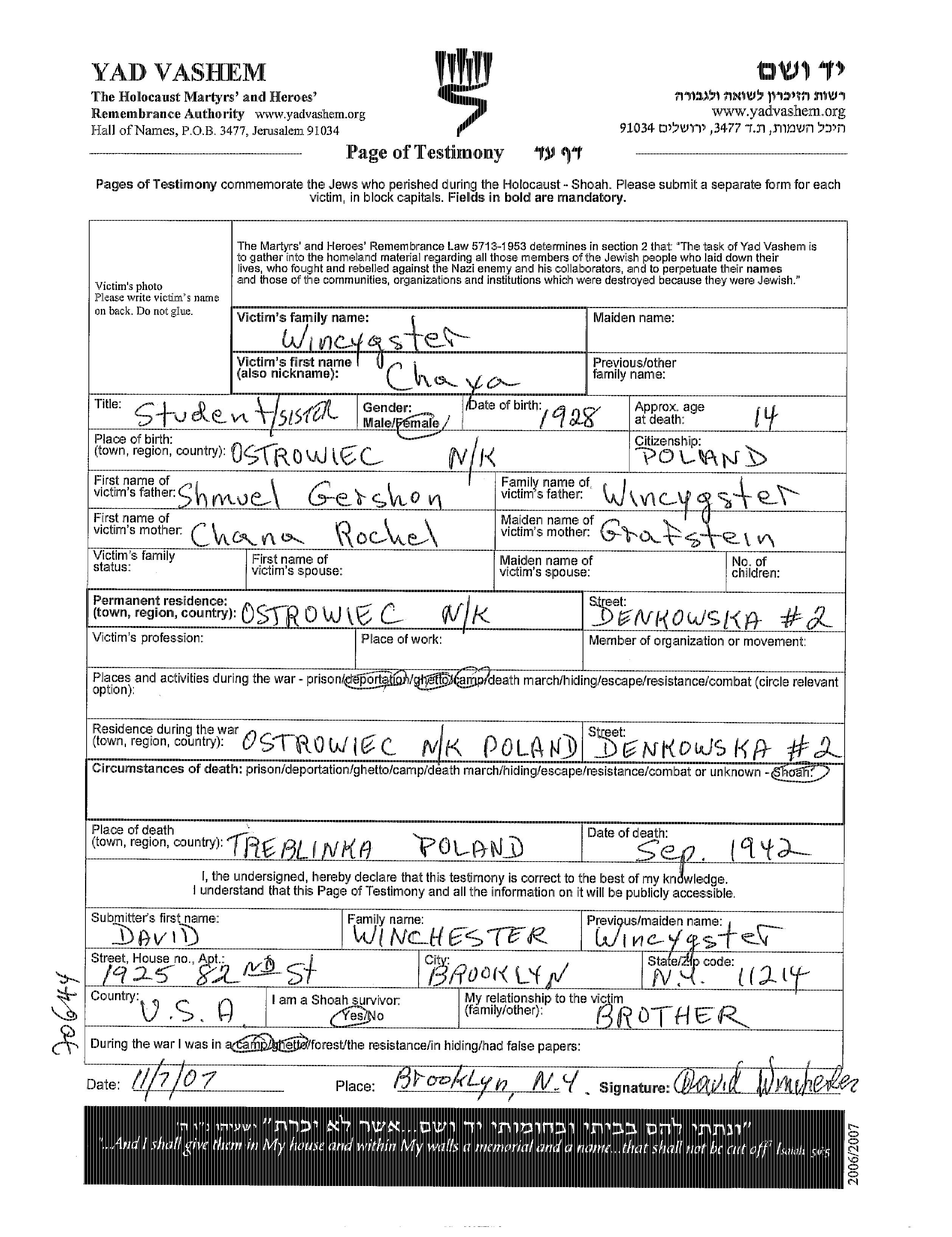 Chaya Wincygster wurde im Jahr 1928 in Ostrowiec, Polen geboren. Sie war die Tochter von Shmuel Gershon und Chana Rochel, geb. Grafstein. Sie war Student. Vor dem Zweiten Weltkrieg lebte sie in Ostrowiec, Polen. Während des Krieges war sie in Ostrowiec, Polen.