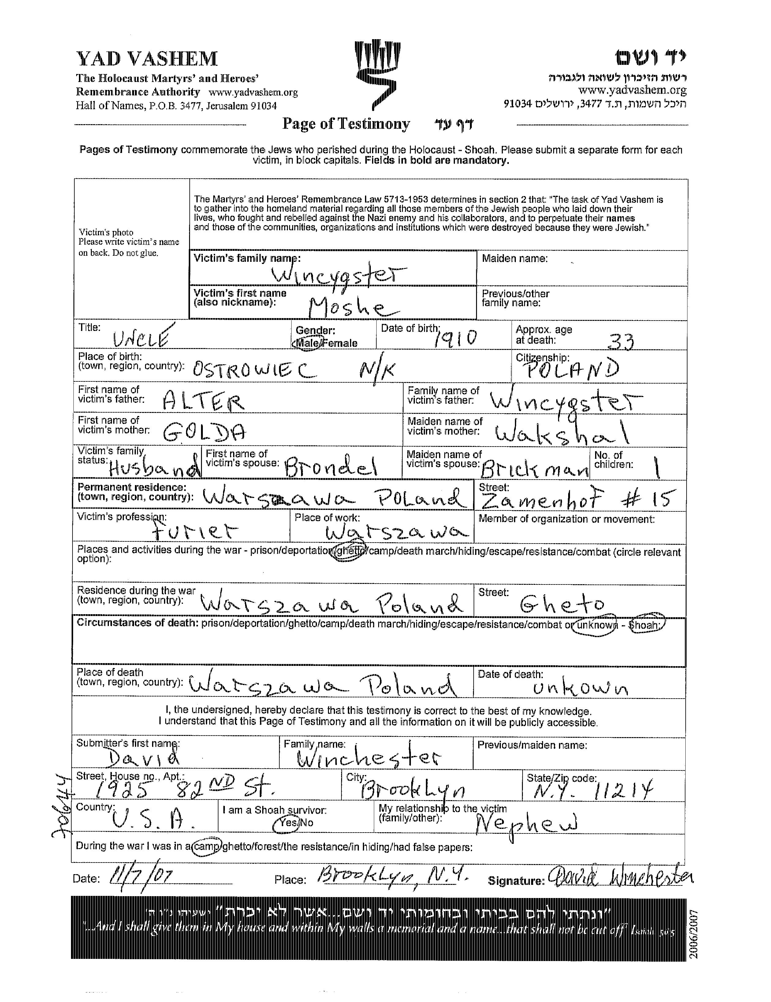 Moshe Wincygster wurde im Jahr 1910 in Ostrowiec, Polen geboren. Er war der Sohn von Alter und Golda, geb. Wakshal. Er war Furier und mit Brondel, geb. Bruckman Verheiratet. Vor dem Zweiten Weltkrieg lebte er in Warszawa, Polen. Während des Krieges war er in Warszawa, Polen.