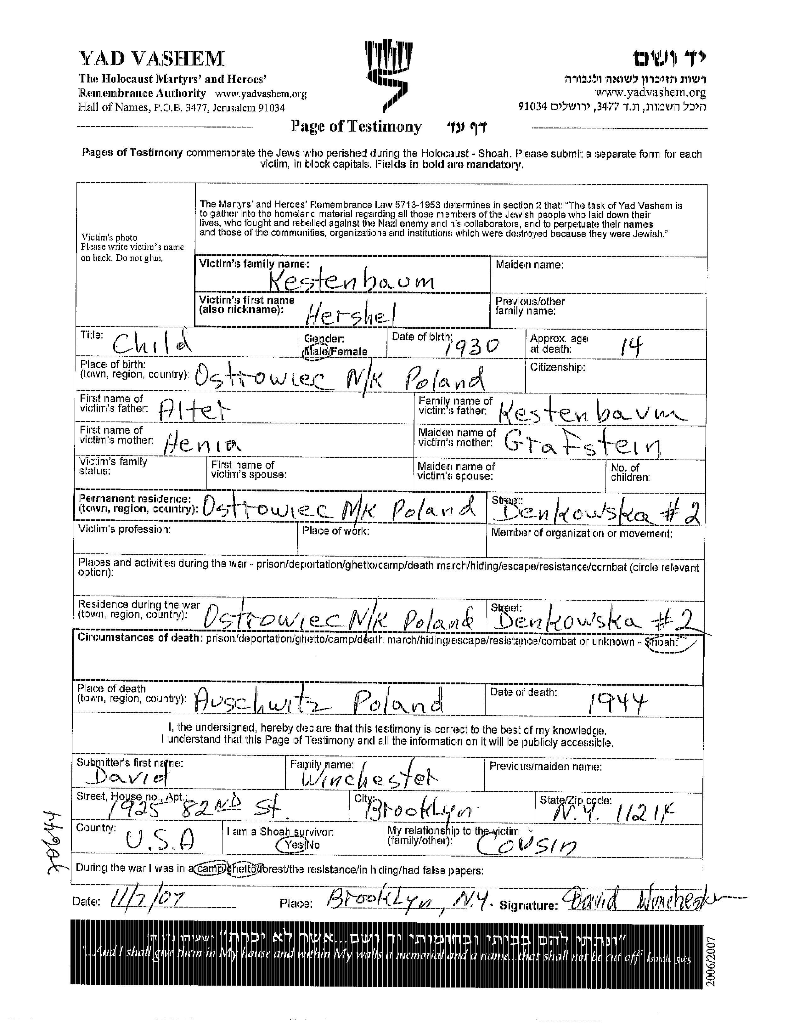 Hershel Kestenbaum wurde im Jahr 1930 in Ostrowiec, Polen geboren. Er war der Sohn von Alter und Henia, geb. Grafstein. Er war Jugendliche/-r. Vor dem Zweiten Weltkrieg lebte er in Ostrowiec, Polen. Während des Krieges war er in Ostrowiec, Polen.