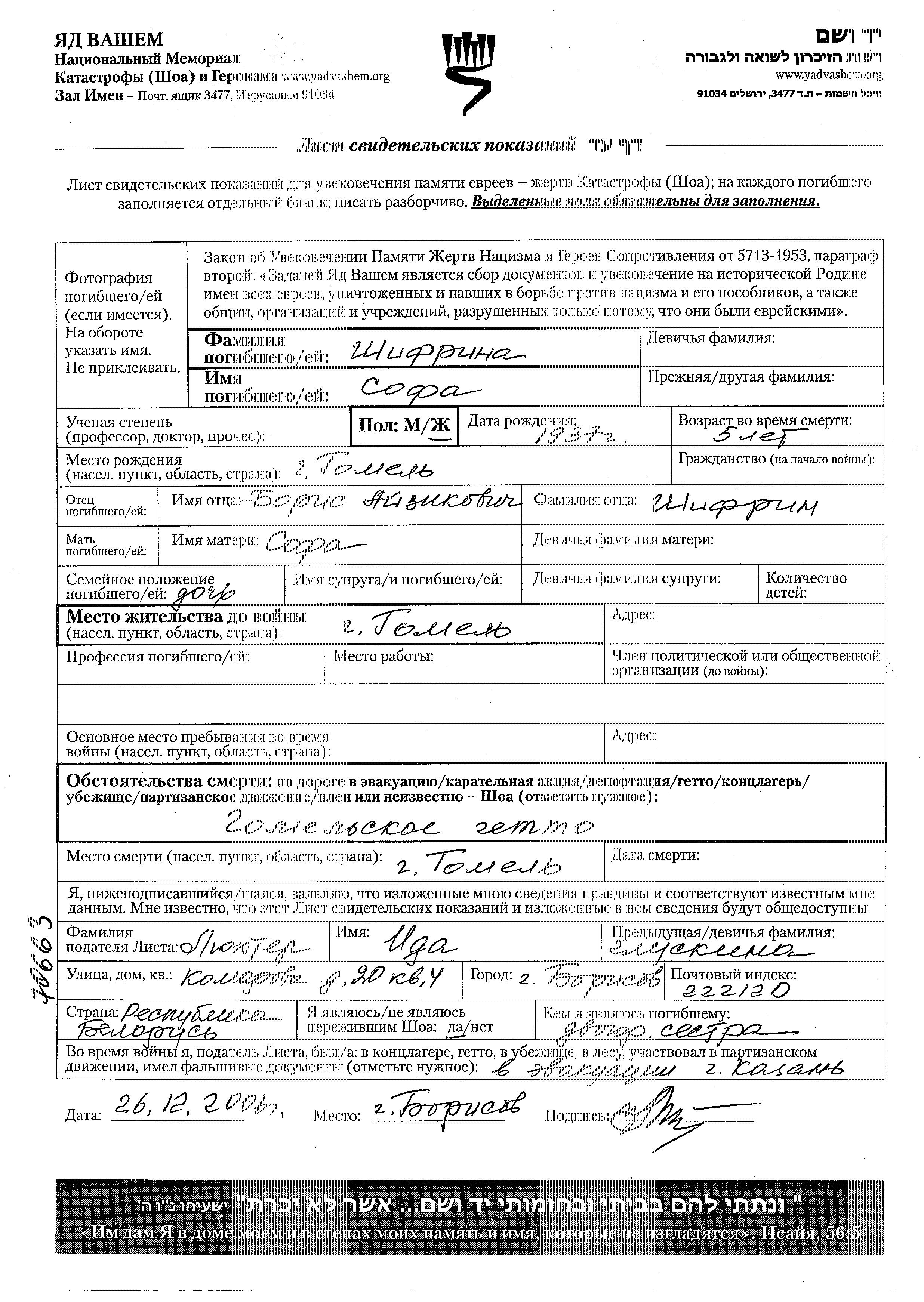 Sofa wurde in der Schoah ermordet. Todesort: Gomel, Weißrussland (UdSSR).