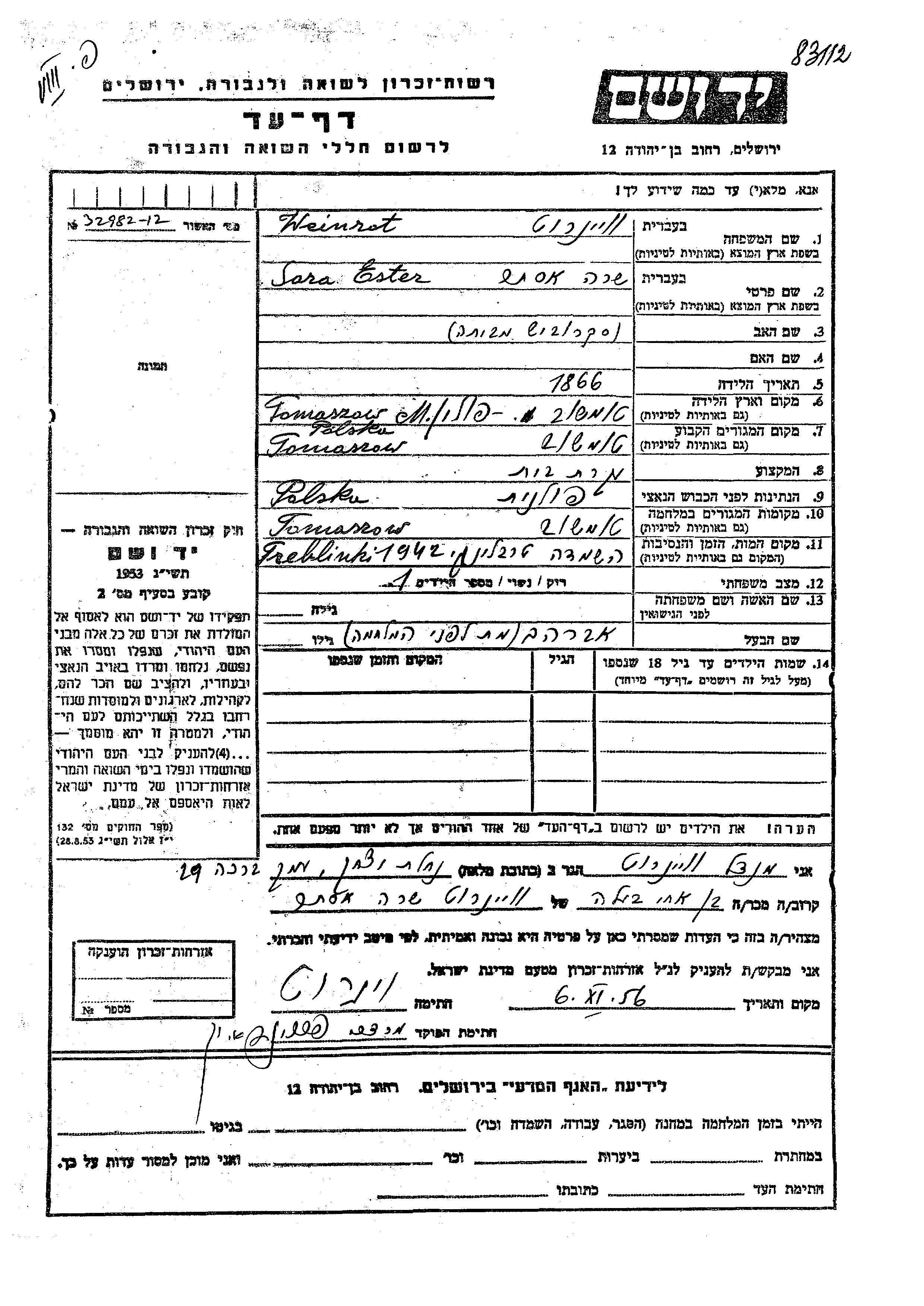 Sara Ester Weinrot, geb. Skrobish wurde im Jahr 1866 in Tomaszow, Polen geboren. Sie war Hausfrau und mit Avraham Witwe. Vor dem Zweiten Weltkrieg lebte sie in Tomaszow, Polen. Während des Krieges war sie in Tomaszow, Polen.
