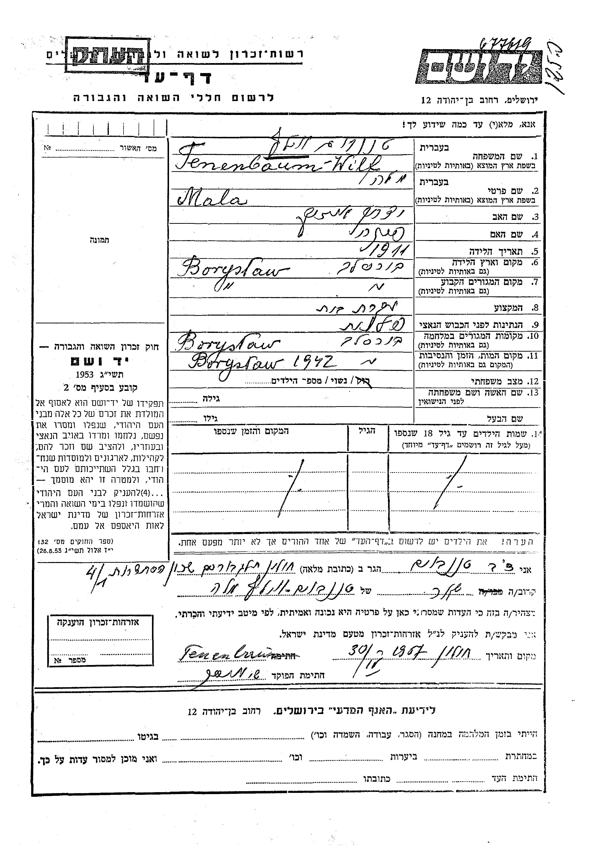 Mala Tenenbaum Wilf wurde im Jahr 1911 in Boryslaw, Polen geboren. Sie war die Tochter von Yitzkhak und Feiga. Sie war Hausfrau und Verheiratet. Vor dem Zweiten Weltkrieg lebte sie in Boryslaw, Polen. Während des Krieges war sie in Boryslaw, Polen.