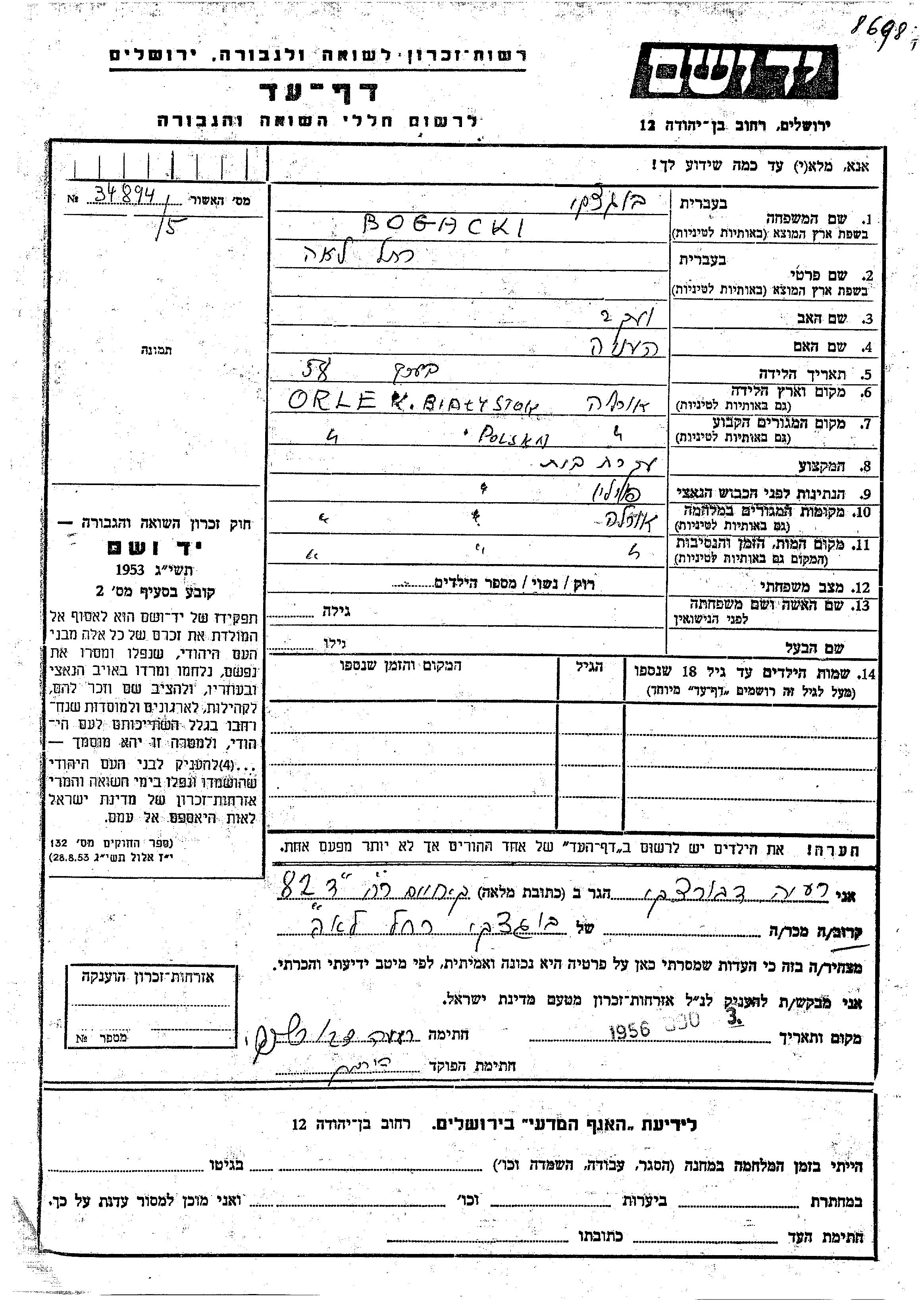 Rakhel Lea Bogacki wurde in Orla, Polen geboren. Sie war die Tochter von Yaakov und Henia. Sie war Hausfrau. Vor dem Zweiten Weltkrieg lebte sie in Orla, Polen. Während des Krieges war sie in Orla, Polen.