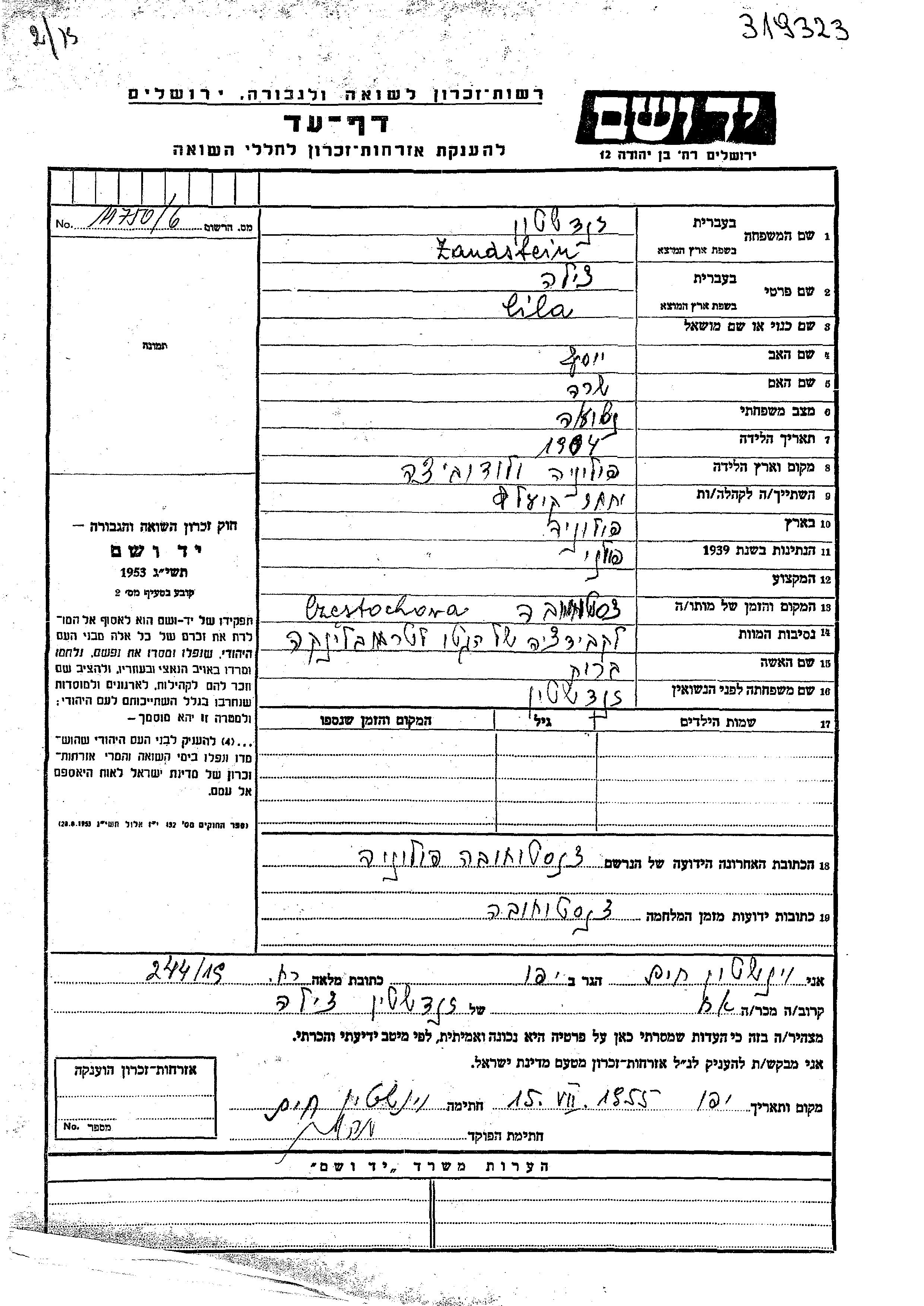 Cila Zandstein, geb. Zandshtein wurde im Jahr 1904 in Wlodowice, Polen geboren. Sie war die Tochter von Yosef und Sara. Sie war mit Ber Verheiratet. Vor dem Zweiten Weltkrieg lebte sie in Kielce, Polen. Während des Krieges war sie in Czestochowa, Polen.