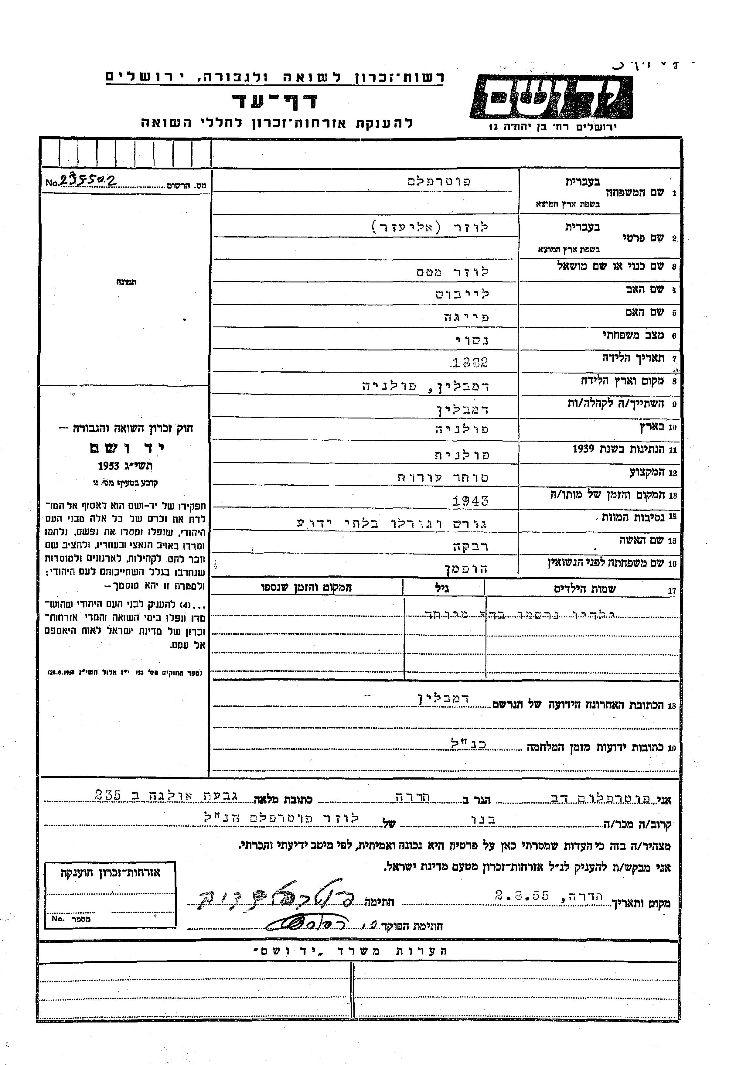Luzer Mates Puterflam wurde im Jahr 1882 in Demblin, Polen geboren. Er war der Sohn von Leibush und Feiga. Er war Lederhändler/-in und mit Rivka, geb. Hofman Verheiratet. Vor dem Zweiten Weltkrieg lebte er in Demblin, Polen. Während des Krieges war er in Demblin, Polen.