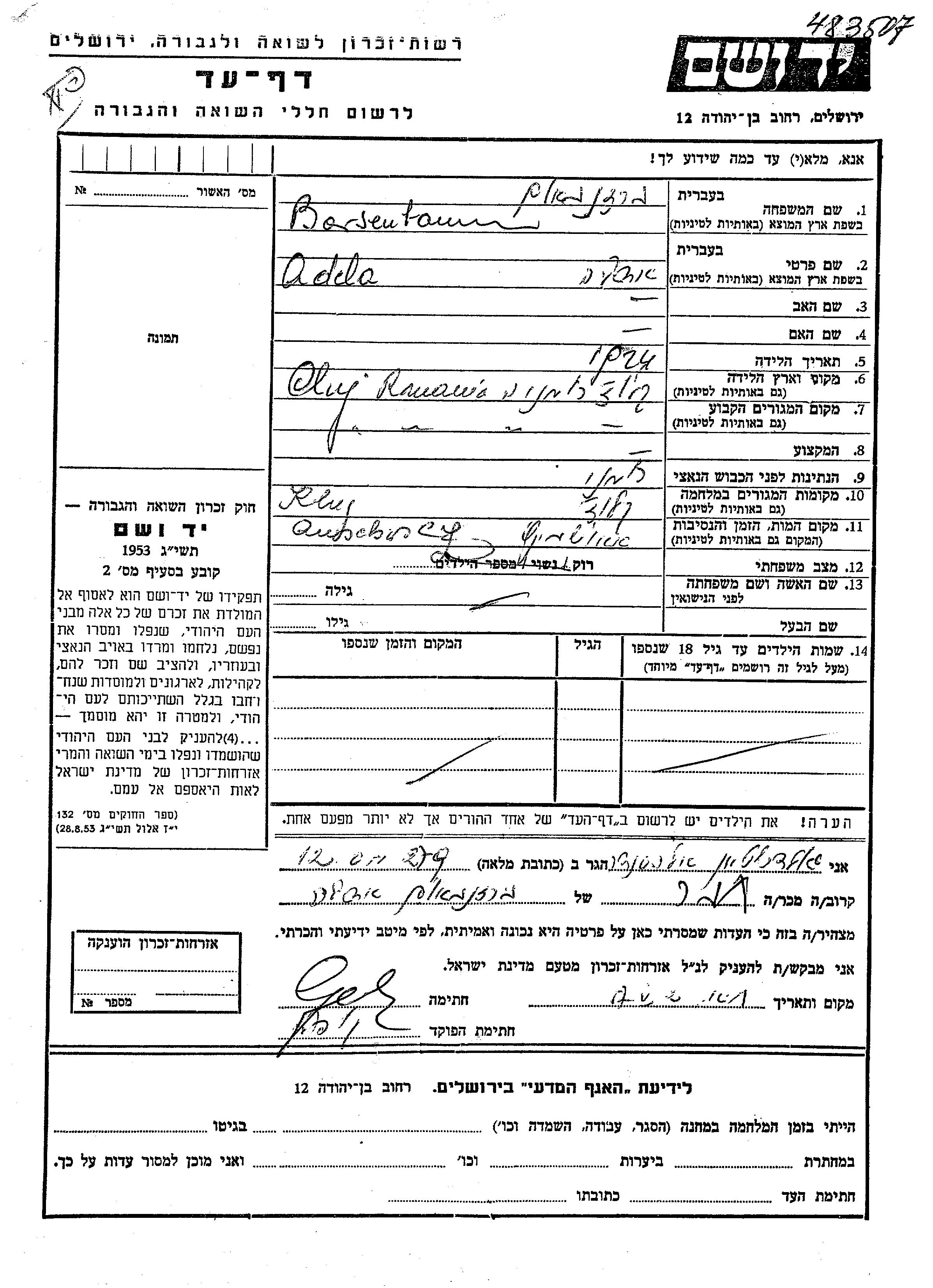 Adela Barsenbaum wurde im Jahr 1924 in Cluj, Rumänien geboren. Sie war Ledig. Vor dem Zweiten Weltkrieg lebte sie in Cluj, Rumänien. Während des Krieges war sie in Cluj, Rumänien.