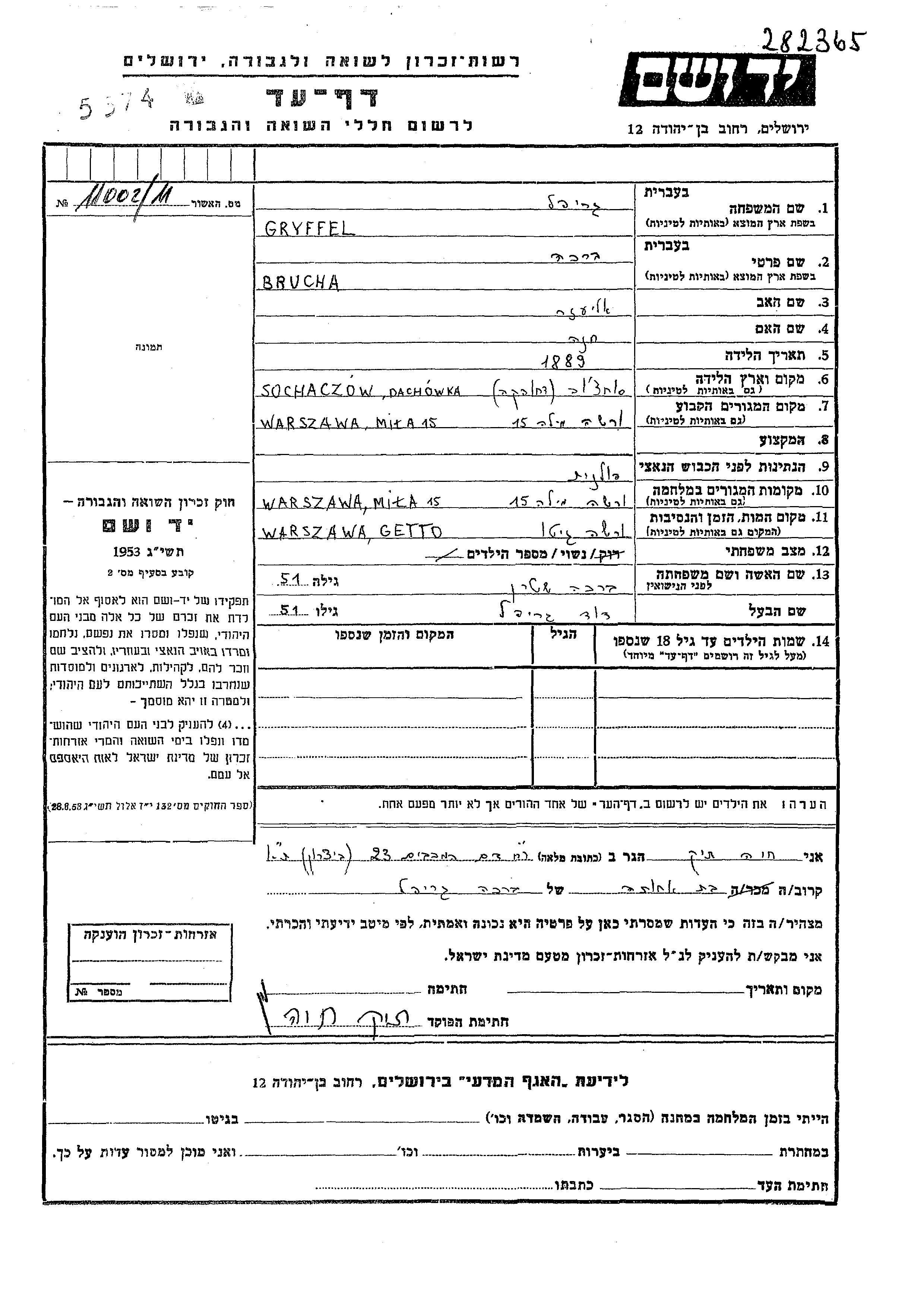 Brucha Gryffel, geb. Shtern wurde im Jahr 1889 in Sochaczew, Polen geboren. Sie war die Tochter von Eliezer und Khana. Sie war mit David Verheiratet. Vor dem Zweiten Weltkrieg lebte sie in Warszawa, Polen. Während des Krieges war sie in Varsha, Polen.