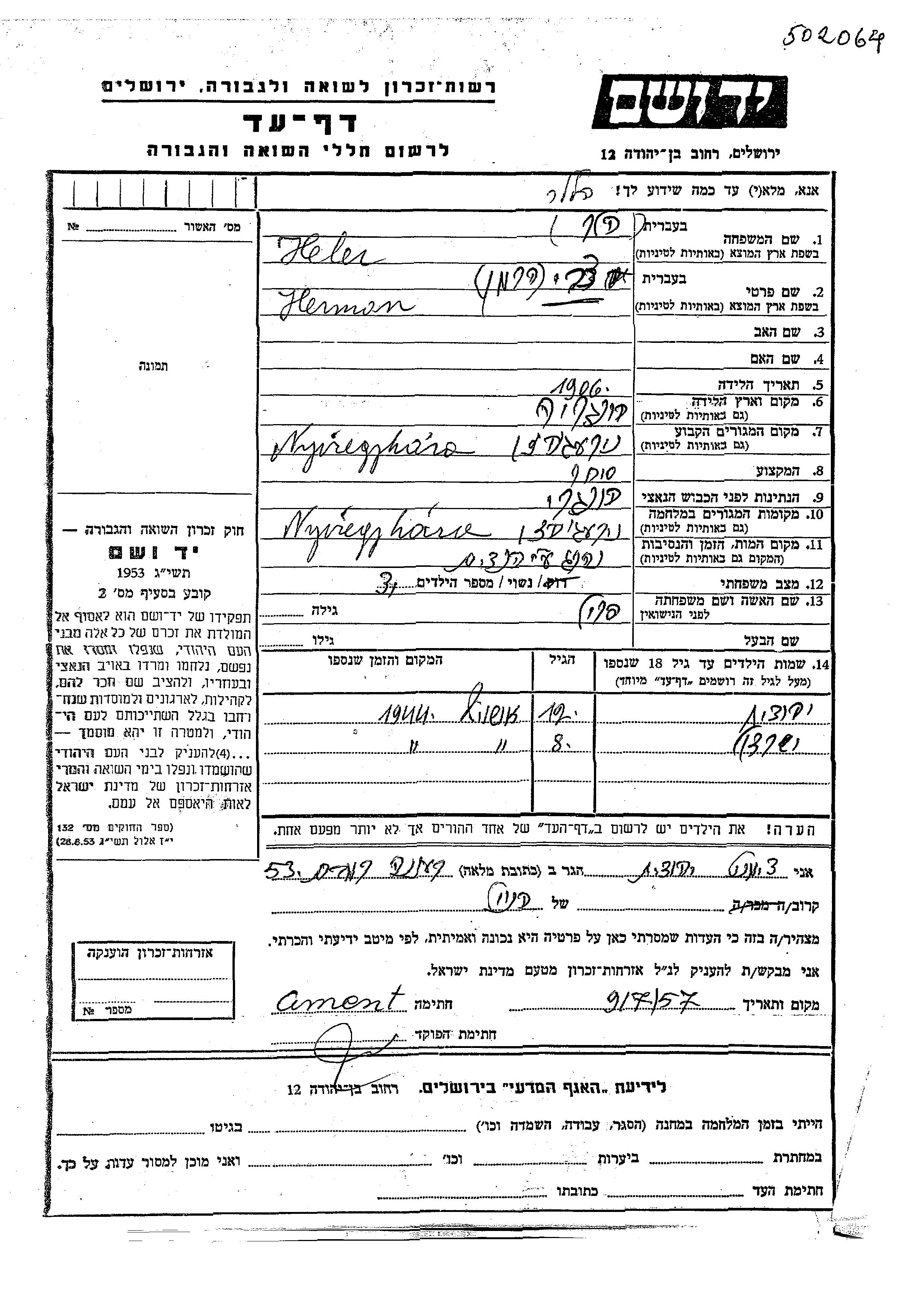 Tzvi Herman Heler wurde im Jahr 1906 in Ungarn geboren. Er war Kaufmann/-frau und mit Peril Verheiratet. Vor dem Zweiten Weltkrieg lebte er in Nyiregyhaza, Ungarn. Während des Krieges war er in Nyiregyhaza, Ungarn.