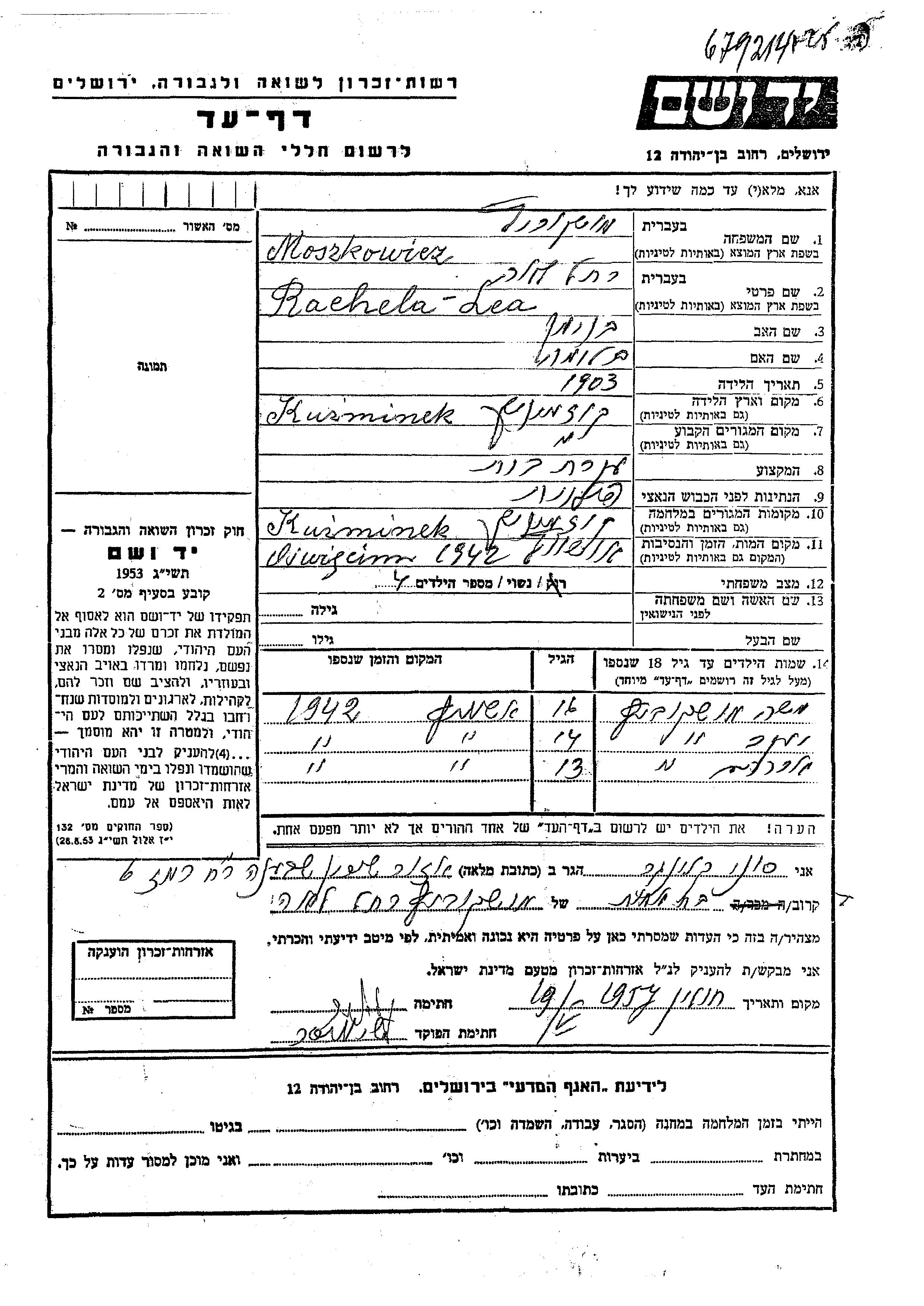 Moszkowicz Rachela Lea 1903 Kozminek, Polen Gedenkblatt
