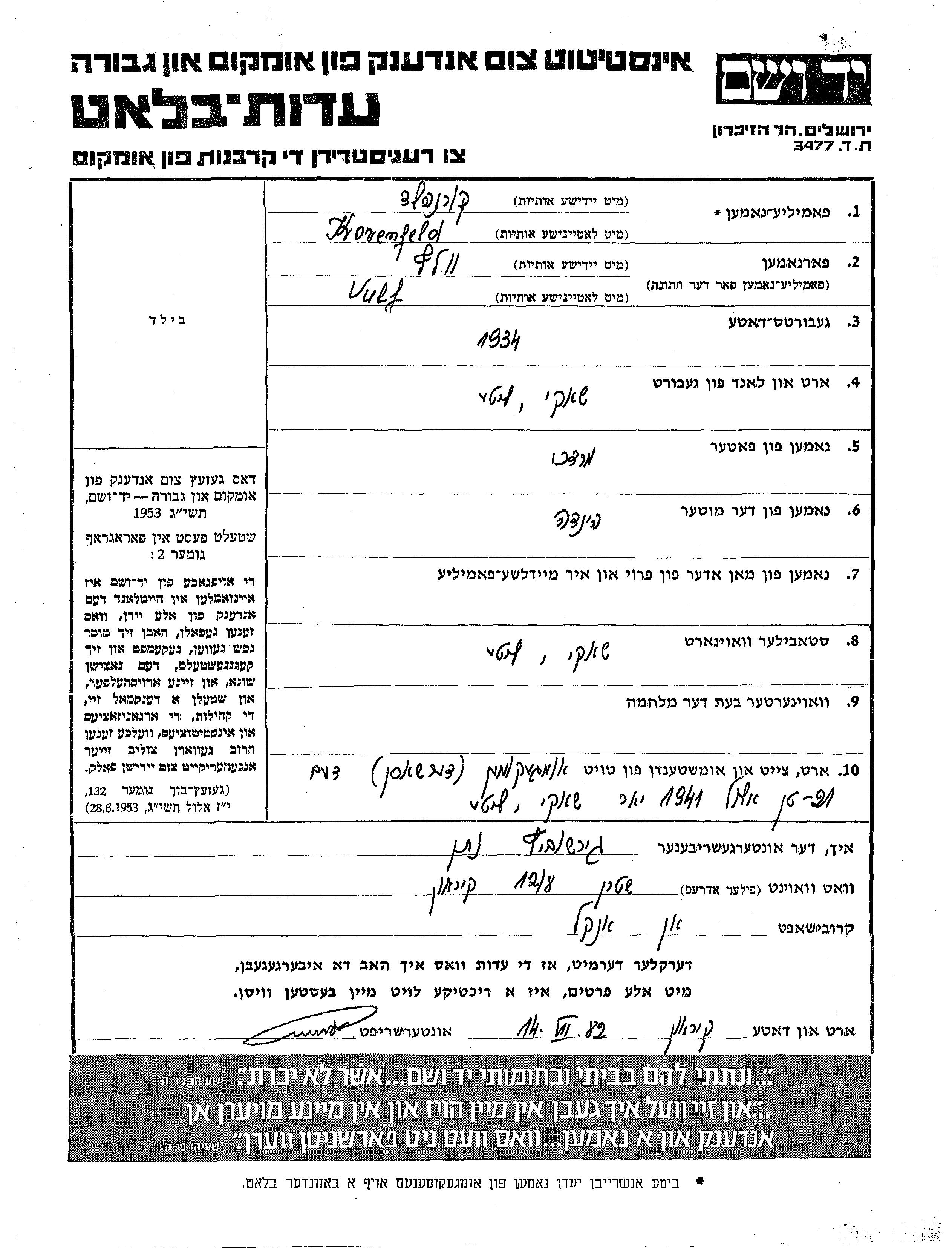 Vulf Korenfeld wurde im Jahr 1934 in Shaki, Litauen geboren. Er war der Sohn von Mordekhai und Hinda. Vor dem Zweiten Weltkrieg lebte er in Shaki, Litauen.
