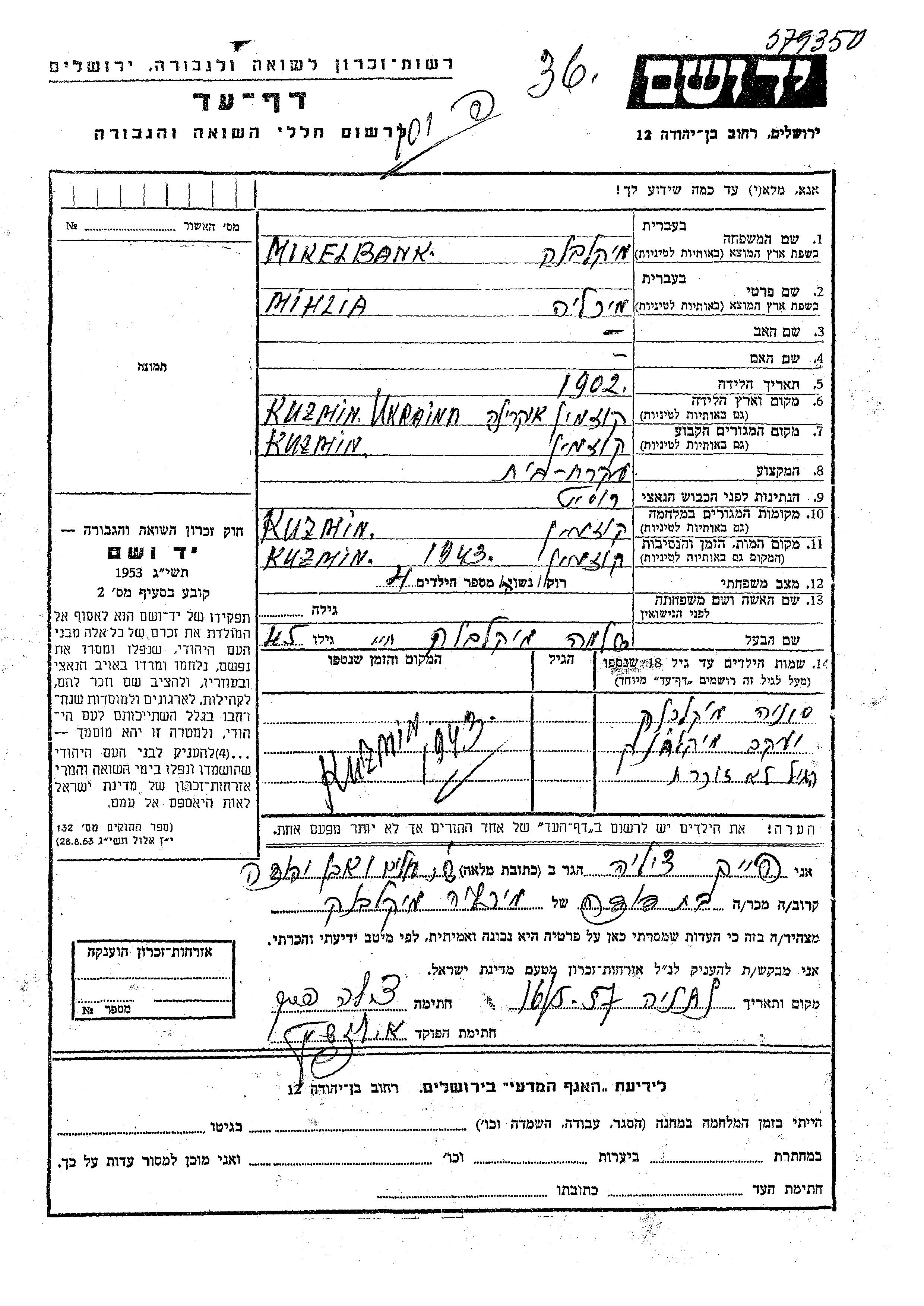 Mihlia Mikelbank wurde im Jahr 1902 in Kuzmin, Ukraine (UdSSR) geboren. Sie war Hausfrau und mit Shlomo Verheiratet. Vor dem Zweiten Weltkrieg lebte sie in Kuzmin, Ukraine (UdSSR). Während des Krieges war sie in Kuzmin, Ukraine (UdSSR).
