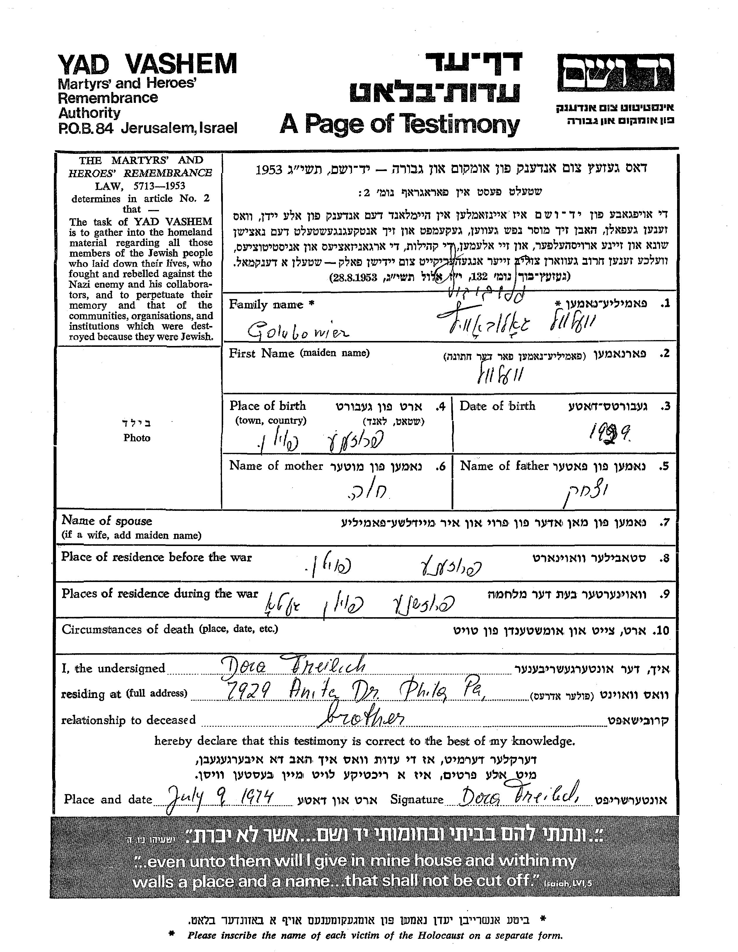 Golubowicz Velvel 1929 Pruzhene, Polen Gedenkblatt