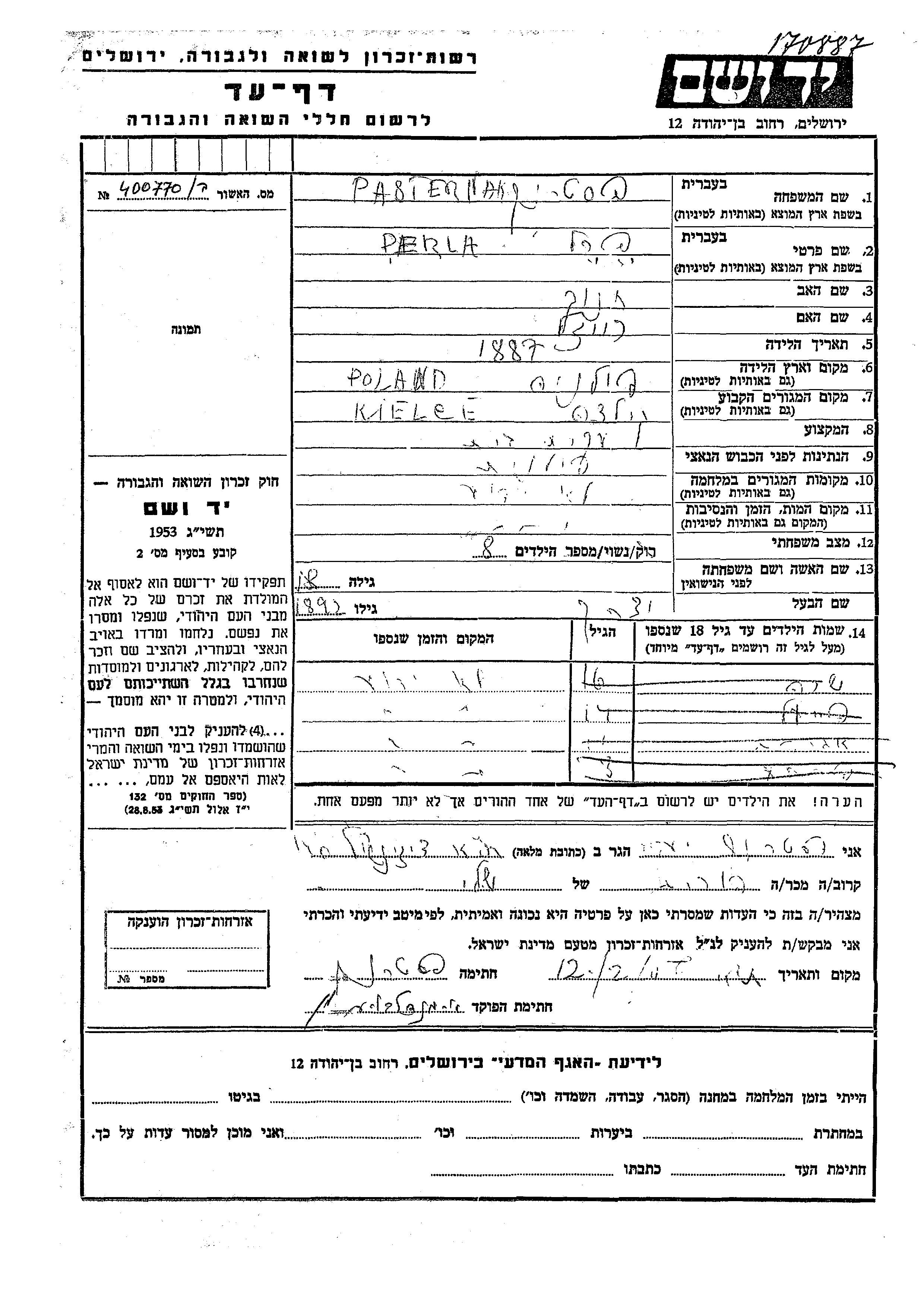 Perla Pasternak wurde im Jahr 1887 in Polen geboren. Sie war die Tochter von Khanokh und Reizl. Sie war Hausfrau und mit Yitzkhak Verheiratet. Vor dem Zweiten Weltkrieg lebte sie in Kielce, Polen.