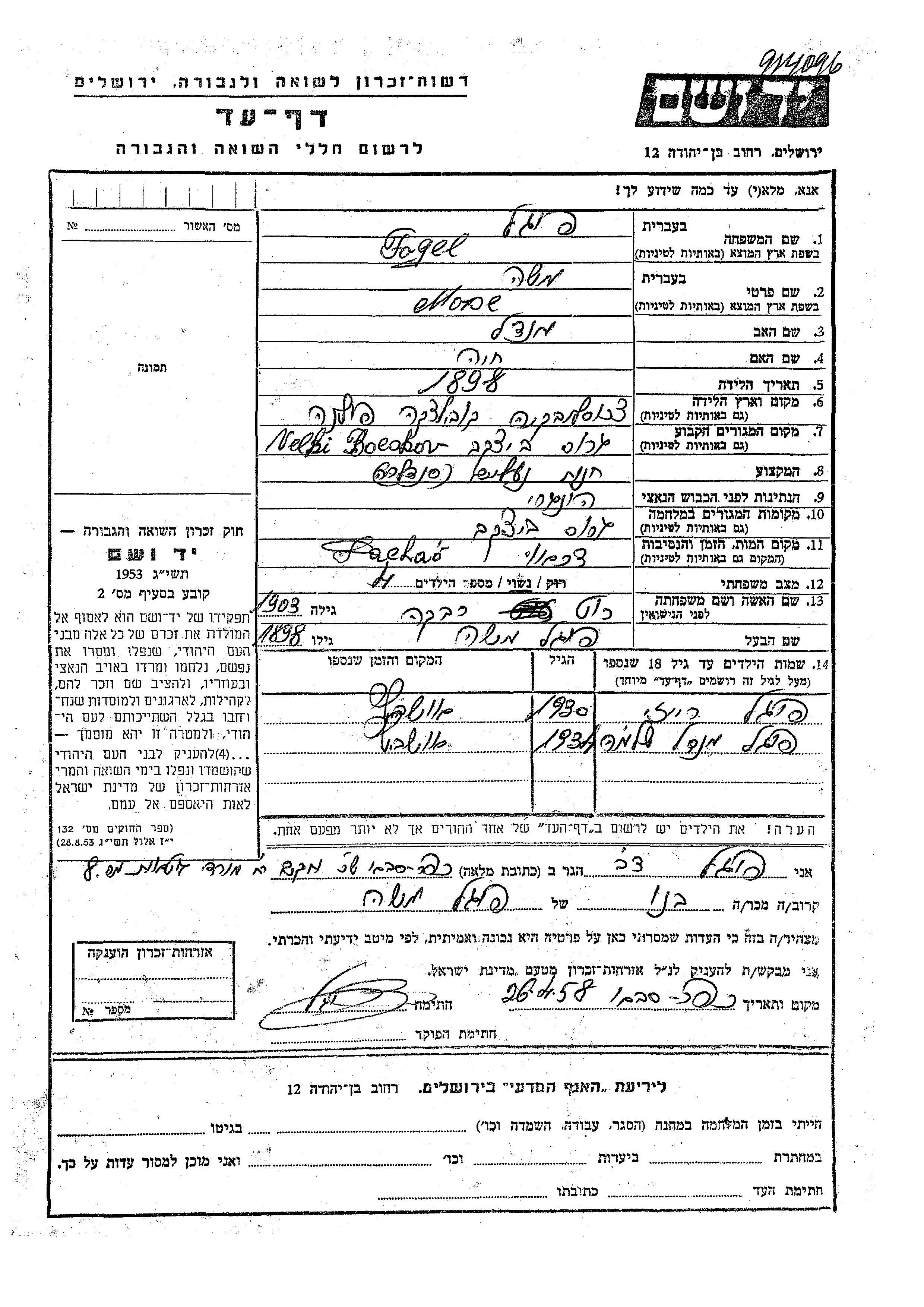 Moise Fogel wurde im Jahr 1898 in Kobilecka Polana, Tschechoslowakei geboren. Er war der Sohn von Mendel und Khaia. Er war mit Rivka, geb. Rut Verheiratet. Vor dem Zweiten Weltkrieg lebte er in Velky Bockov, Tschechoslowakei. Während des Krieges war er in Velky Bockov, Tschechoslowakei.