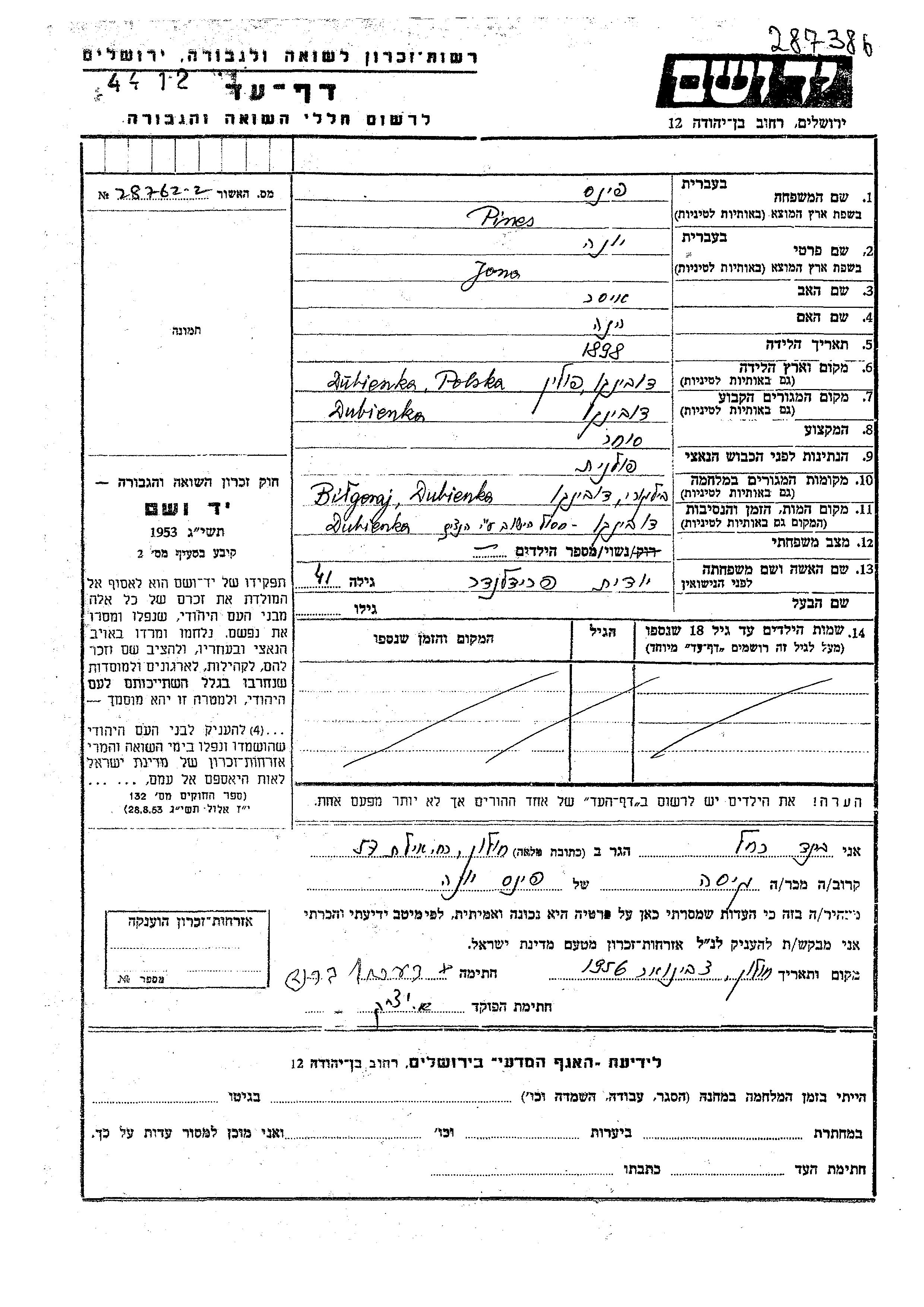 Jona Pines wurde im Jahr 1898 in Dubienka, Polen geboren. Er war der Sohn von Isser und Hena. Er war Kaufmann/-frau und mit Iudit, geb. Fridlender Verheiratet. Vor dem Zweiten Weltkrieg lebte er in Dubienka, Polen.