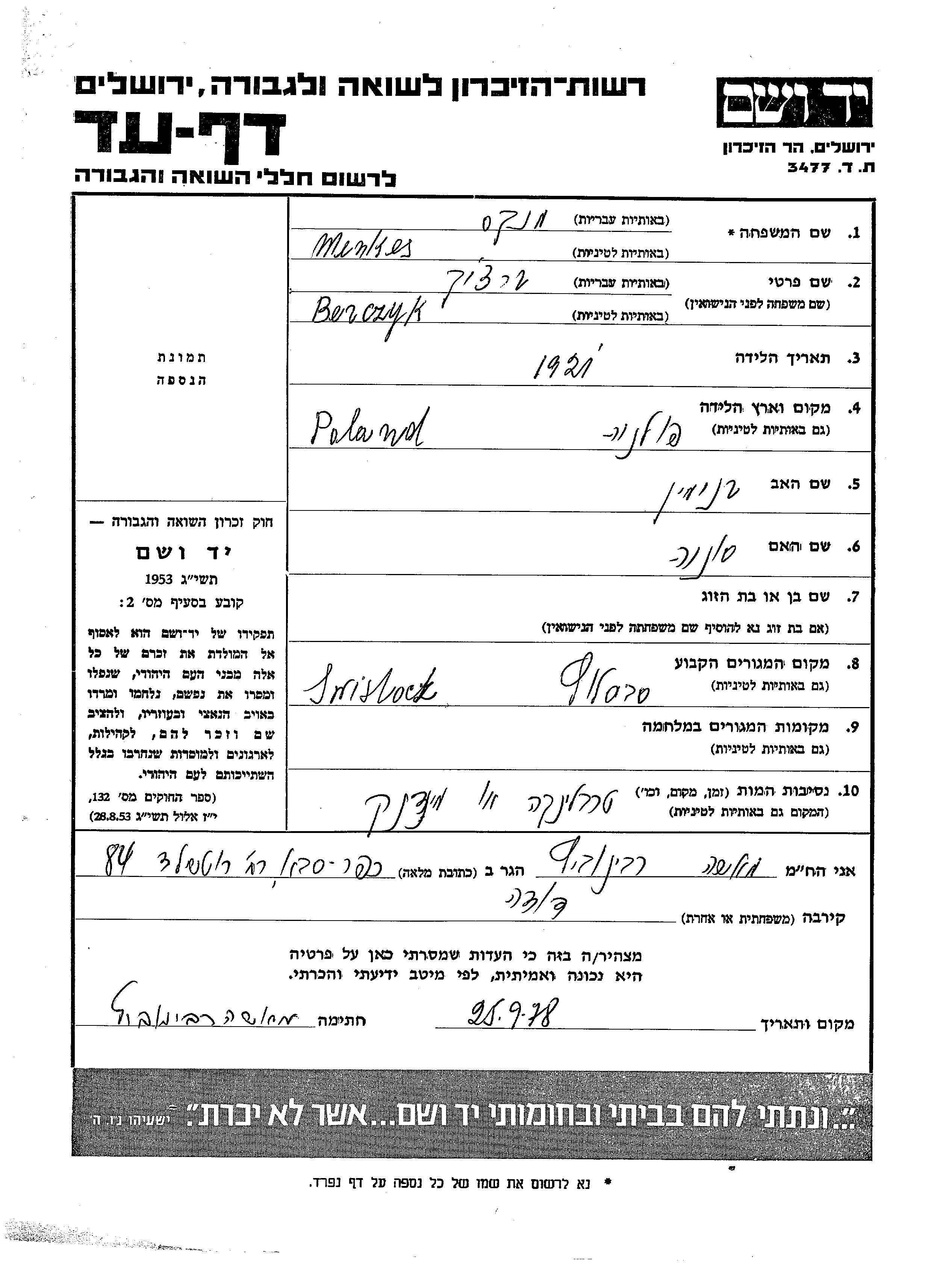 Menkes Berczyk 1921 Swislocz, Polen Gedenkblatt