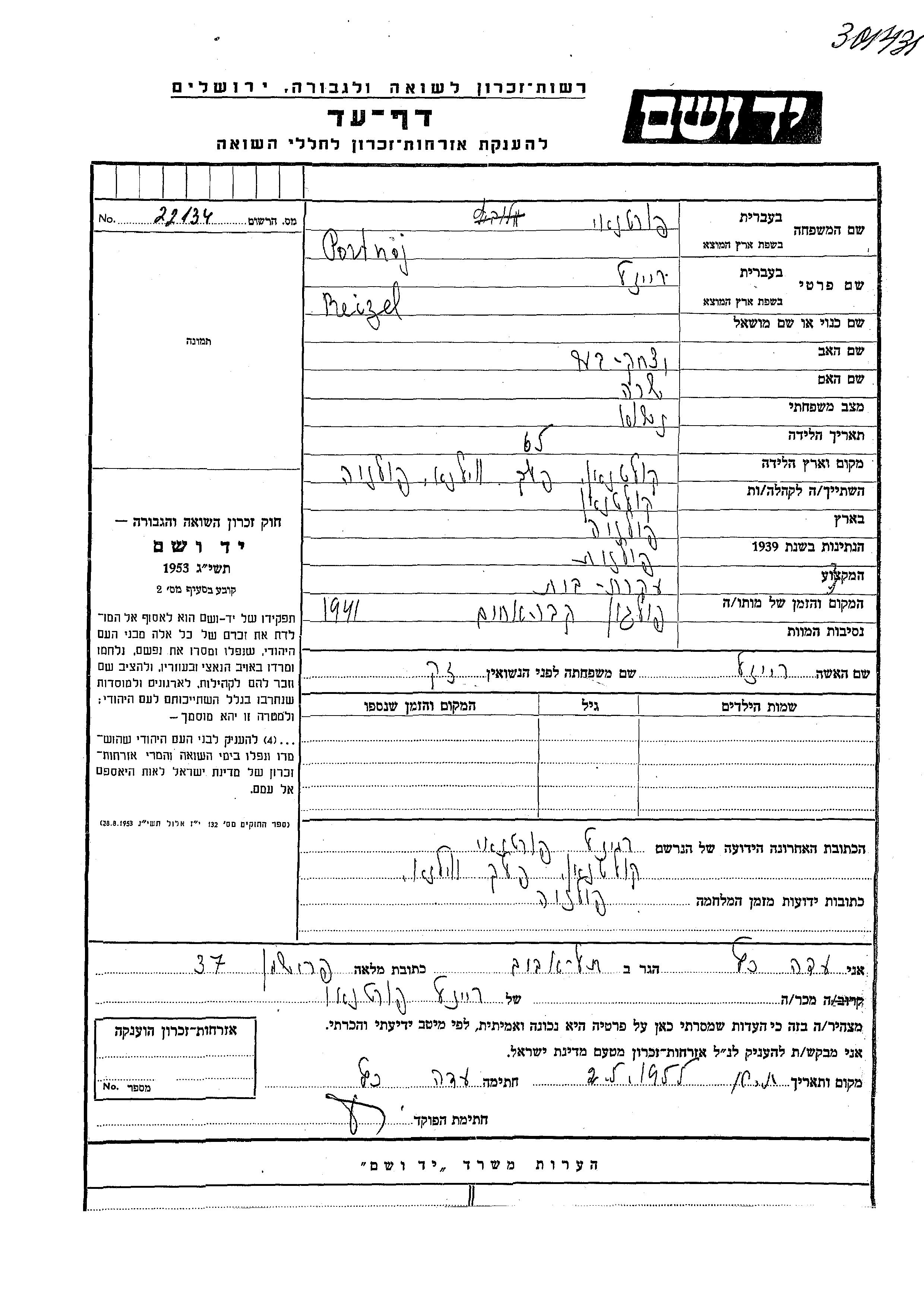 Reizl Portnoj, geb. Zak wurde in Koltaniana, Polen geboren. Sie war die Tochter von Yitzkhak David und Sara. Sie war Hausfrau. Vor dem Zweiten Weltkrieg lebte sie in Koltaniana, Polen. Während des Krieges war sie in Polen.