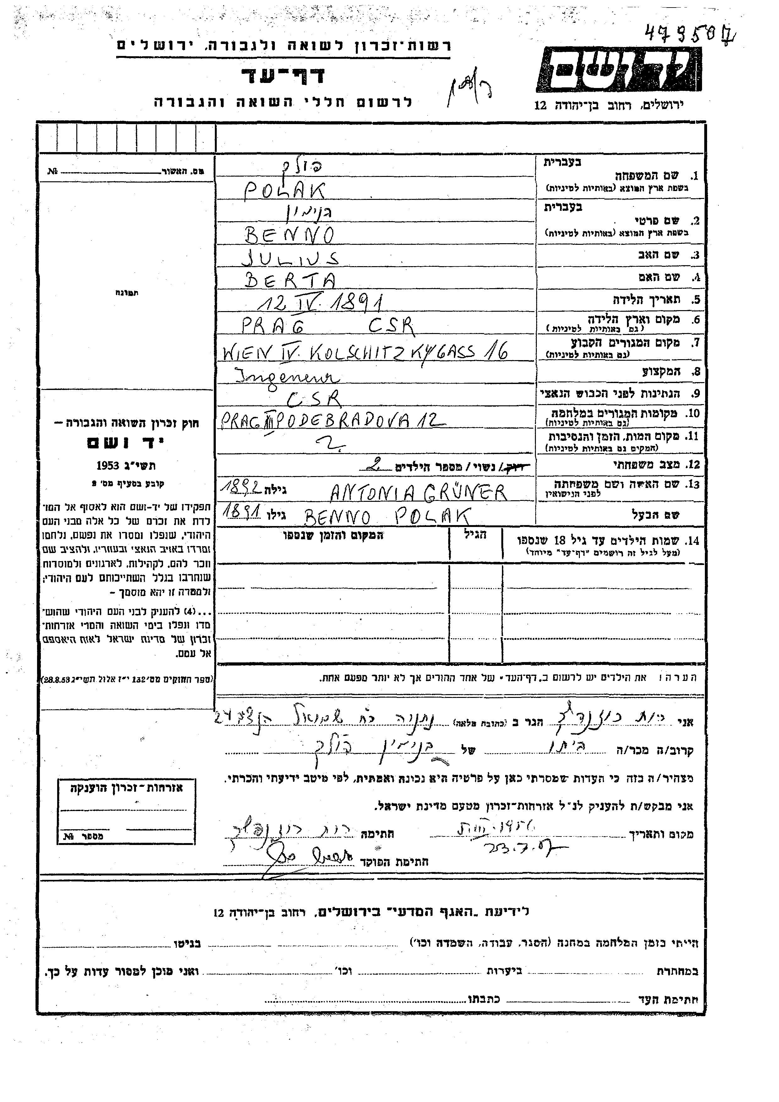 Benno Polak wurde im Jahr 1891 in Prague, Tschechoslowakei geboren. Er war der Sohn von Julius und Berta. Er war Ingenieur und mit Antonia, geb. Gruner Verheiratet. Vor dem Zweiten Weltkrieg lebte er in Wien, Österreich. Während des Krieges war er in Prag, Tschechoslowakei.