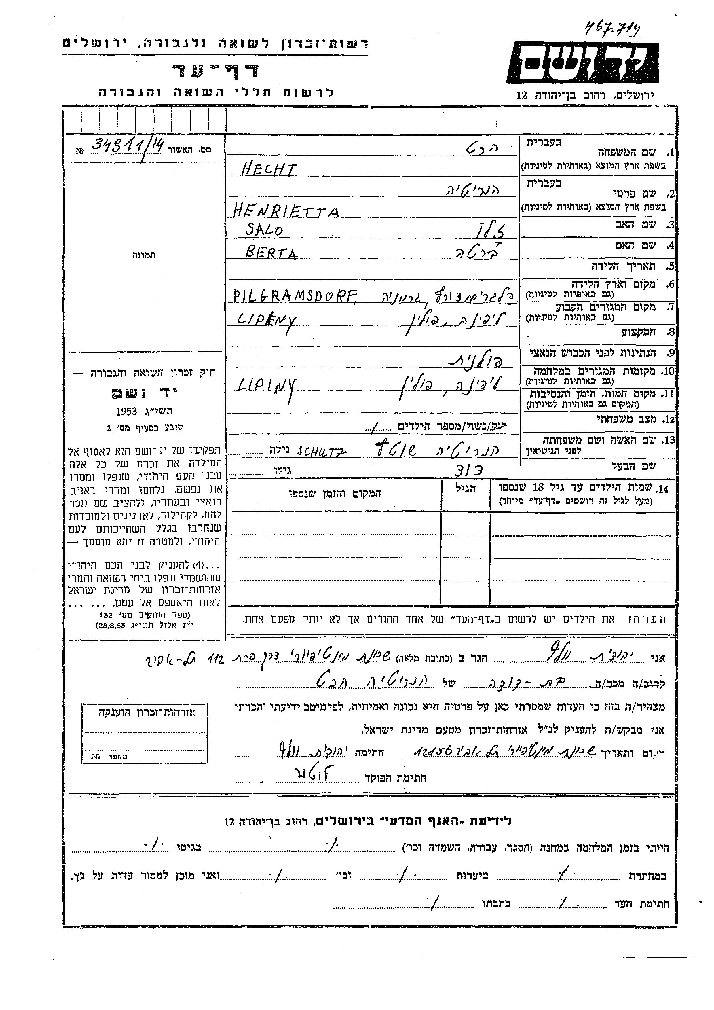 Henrietta Hecht, geb. Schűtz Shotz wurde in Pilgramsdorf, Tschechoslowakei geboren. Sie war die Tochter von Salo und Berta. Sie war mit David Verheiratet. Vor dem Zweiten Weltkrieg lebte sie in Lipiny, Polen. Während des Krieges war sie in Lipiny, Polen.