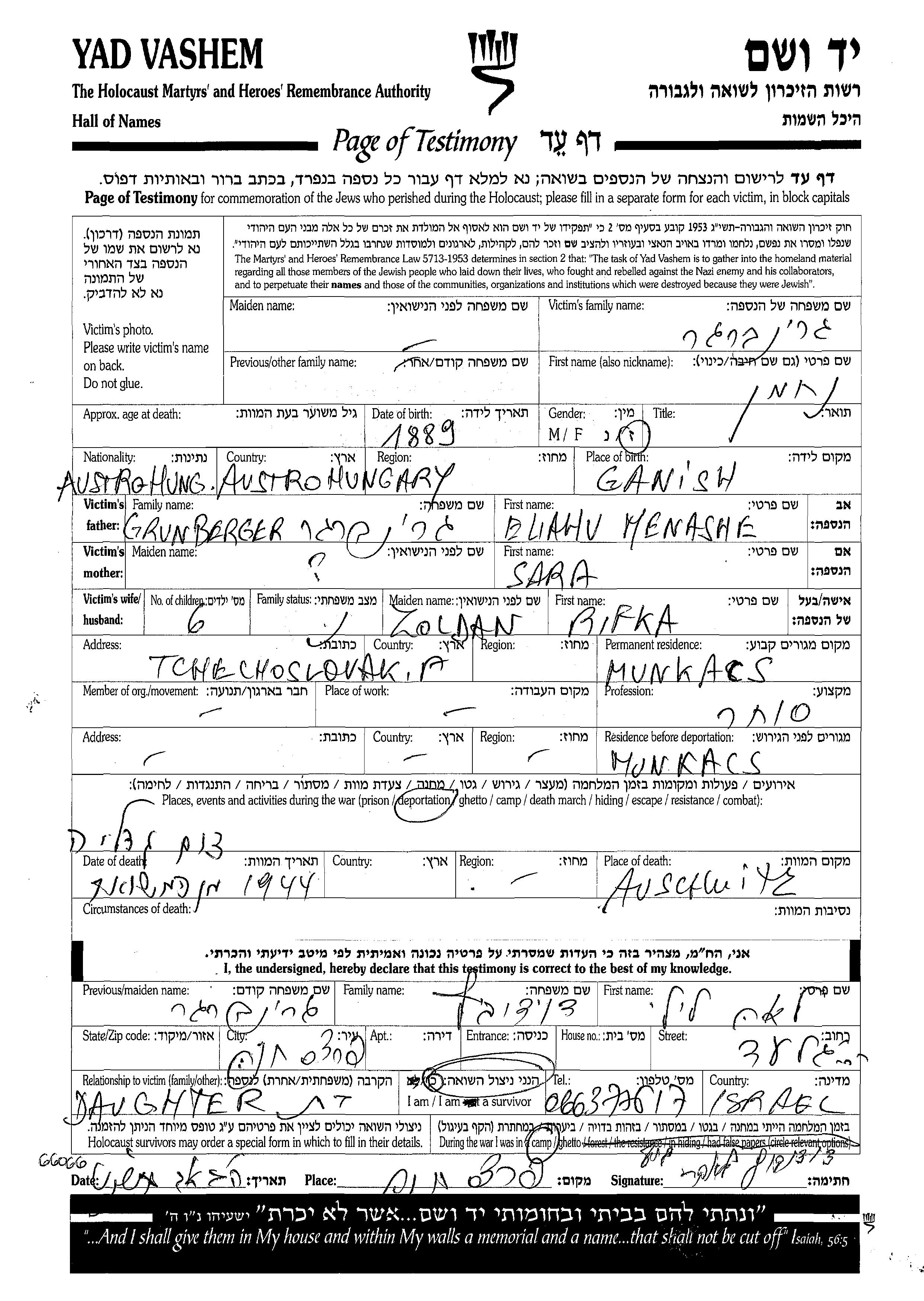 Nachman Grunberger wurde im Jahr 1895 in Ganice, Tschechoslowakei geboren. Er war der Sohn von Eliahu Menashe und Sara. Er war Kaufmann/-frau und mit Rivka, geb. Zoldan Verheiratet. Vor dem Zweiten Weltkrieg lebte er in Munkacs, Tschechoslowakei. Während des Krieges war er in Munkacs, Tschechoslowakei.