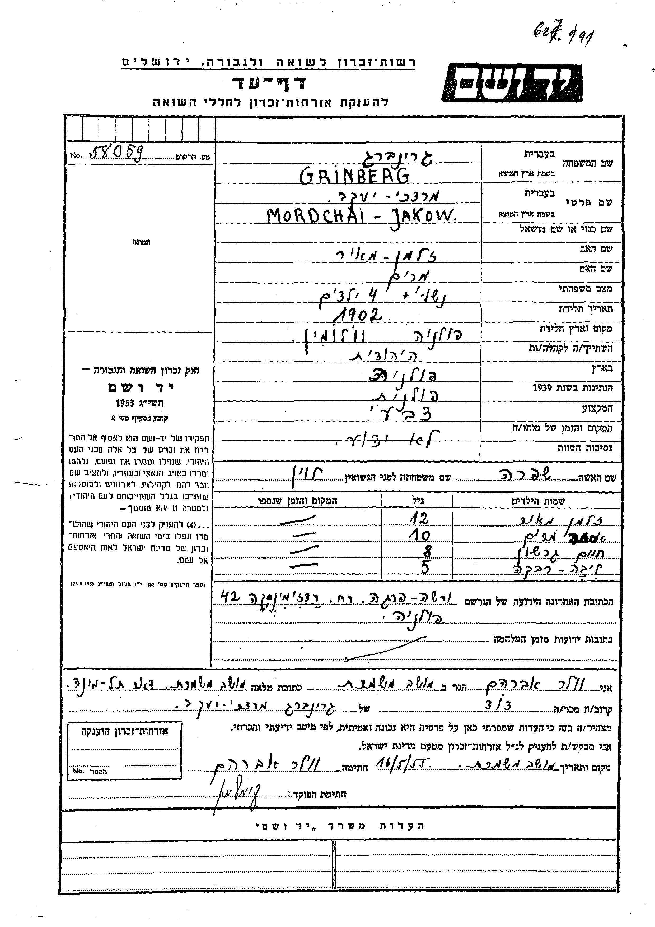 Grinberg Mordechai Jakow 1902 Polen Gedenkblatt