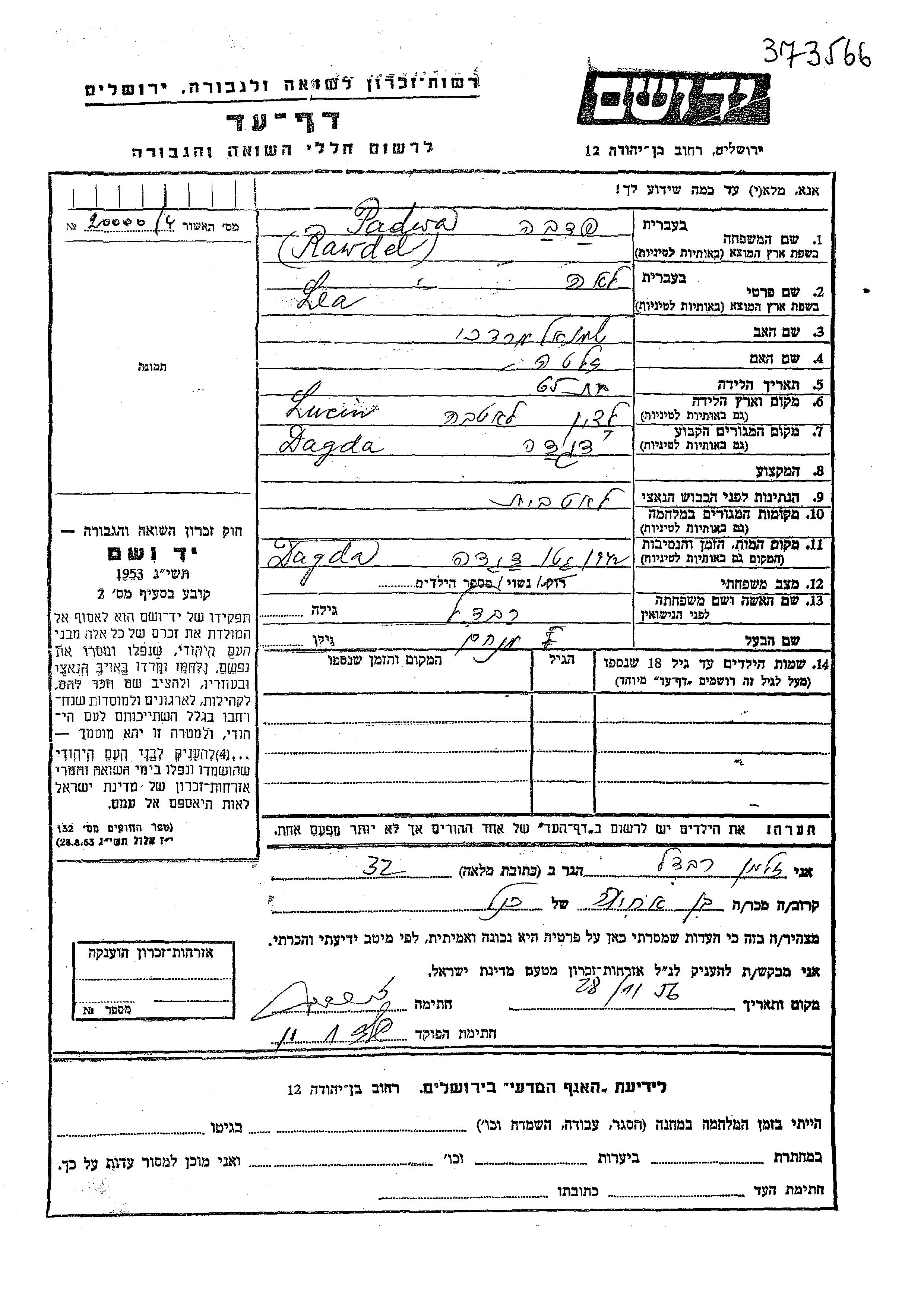 Lea Padwa, geb. Rawdel wurde in Lutsen, Lettland geboren. Sie war die Tochter von Shmuel Mordekhai und Zlata. Sie war mit Menakhem Verheiratet. Vor dem Zweiten Weltkrieg lebte sie in Dagda, Lettland.