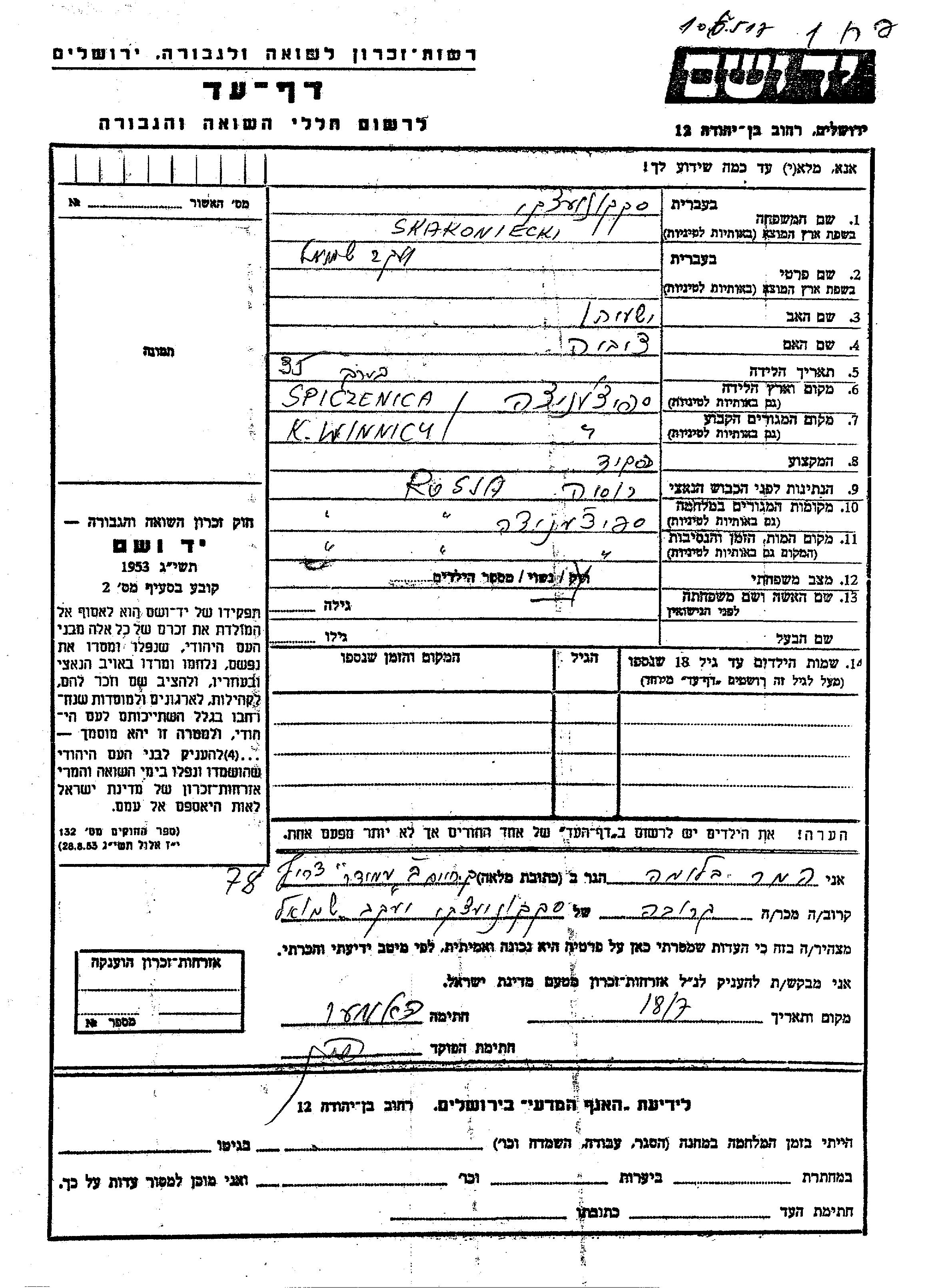 Yaakov Shmuel Skakoniecki wurde in Spiczenica, Ukraine (UdSSR) geboren. Er war der Sohn von Yeshayahu und Tzivia. Er war Angestellte/-r und Verheiratet. Vor dem Zweiten Weltkrieg lebte er in Spiczenica, Ukraine (UdSSR). Während des Krieges war er in Spiczenica, Ukraine (UdSSR).
