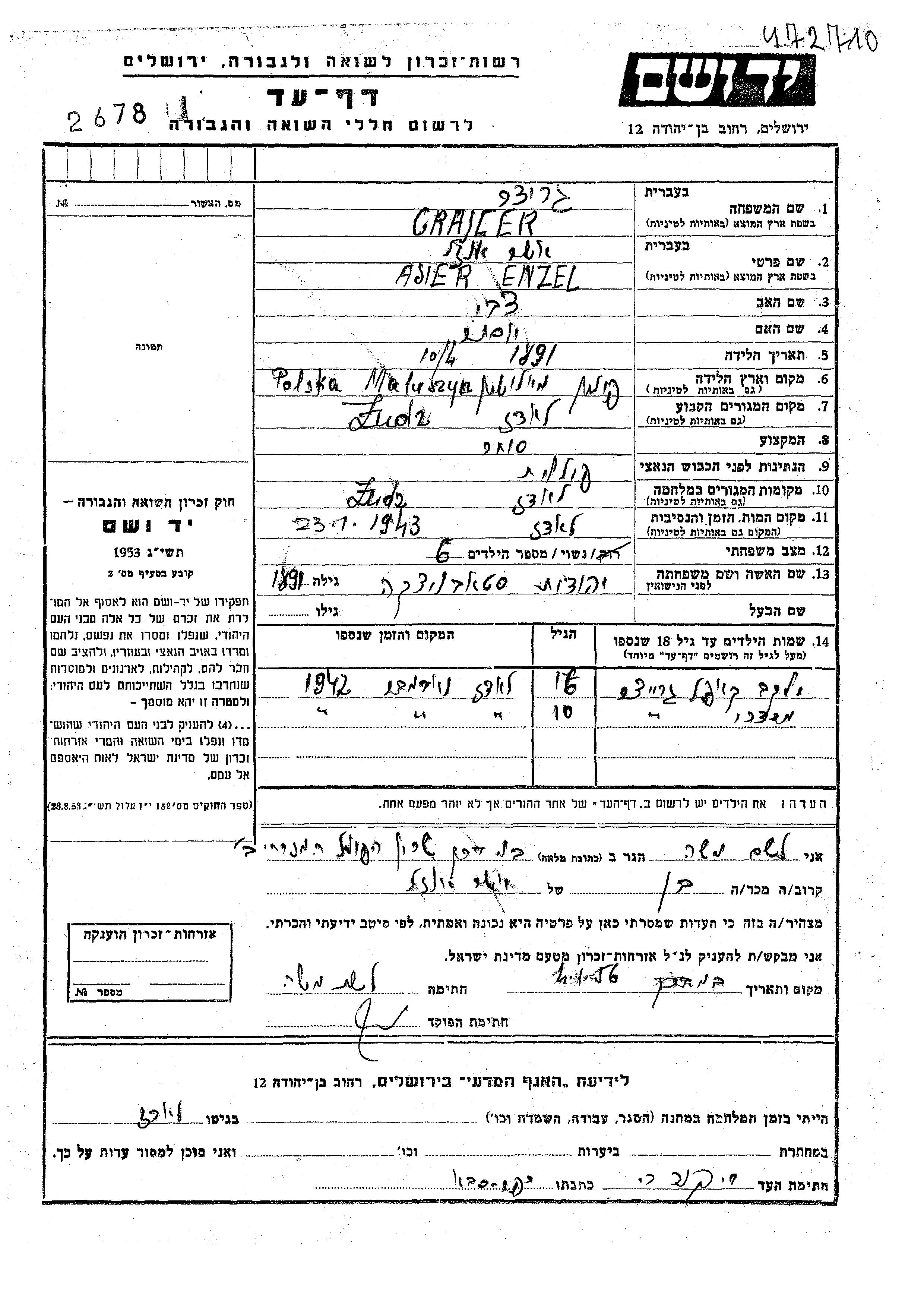 Asier Engel Grajcer wurde im Jahr 1891 in Maluszyn, Polen geboren. Er war der Sohn von Tzvi und Ester. Er war Kaufmann/-frau und mit Yehudit, geb. Stobnitzki Verheiratet. Vor dem Zweiten Weltkrieg lebte er in Lodz, Polen. Während des Krieges war er in Lodz, Polen.