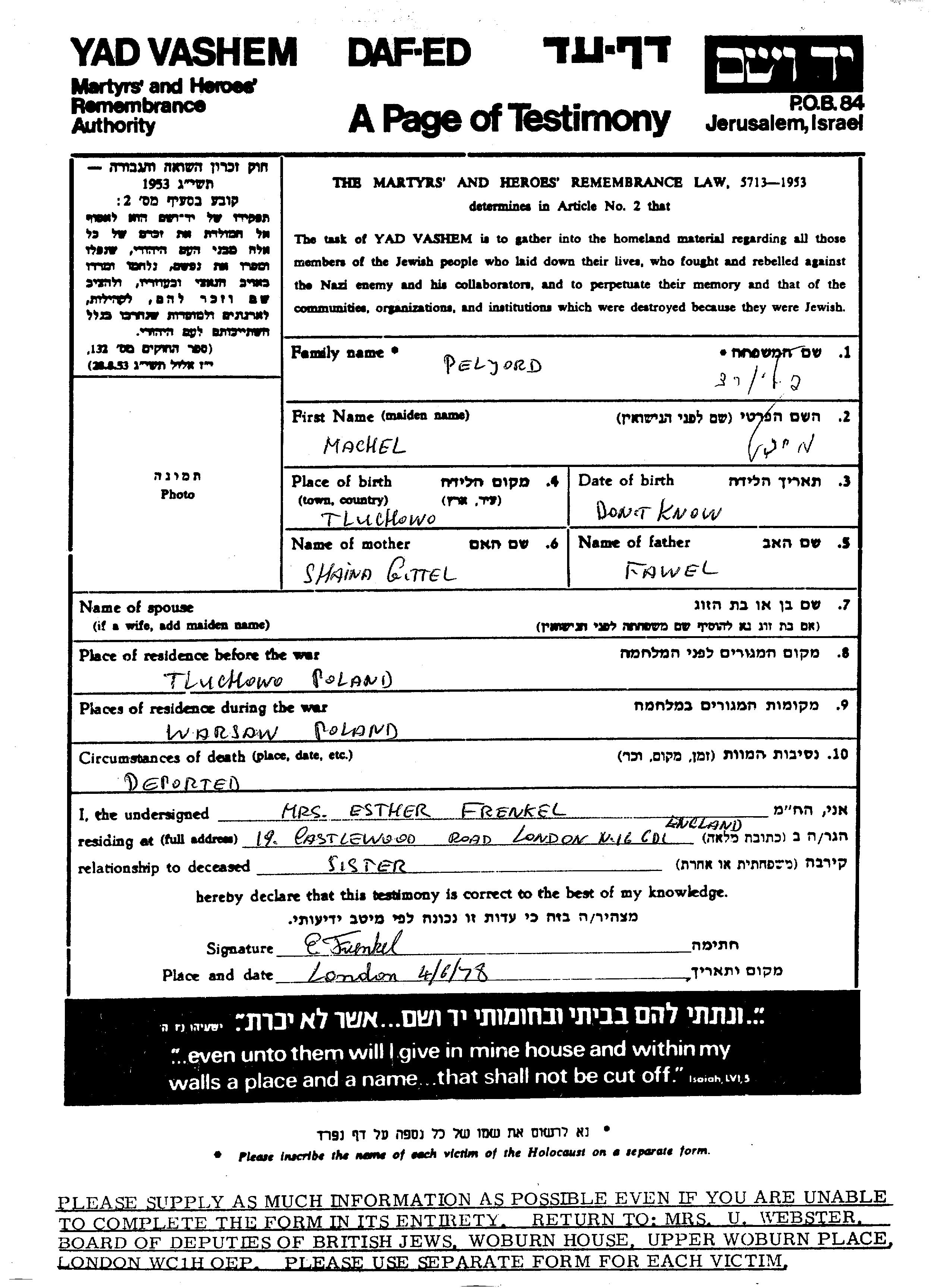 Machel Peljord wurde in Tluchowo, Polen geboren. Er war der Sohn von Fawel und Shaina Gittel. Vor dem Zweiten Weltkrieg lebte er in Tluchowo, Polen. Während des Krieges war er in Warsaw, Polen.