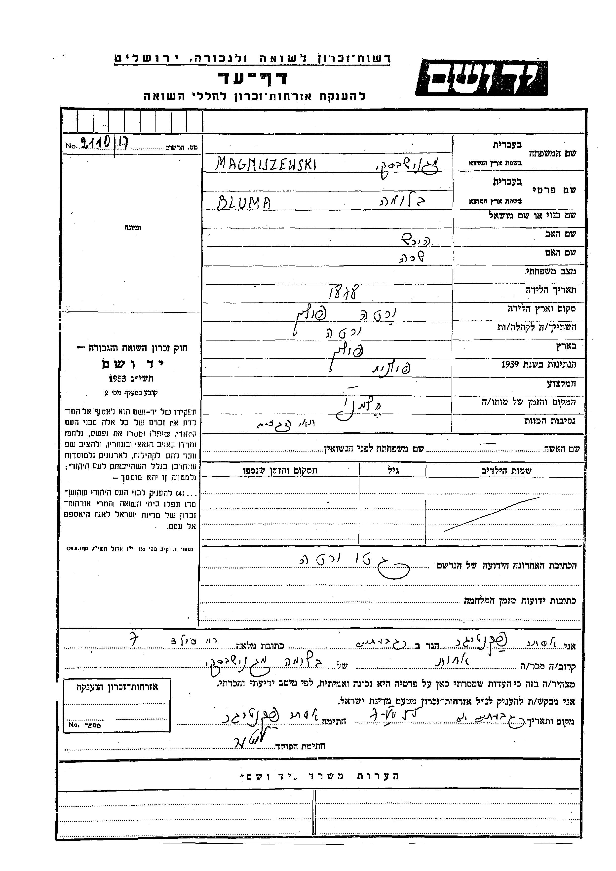 Bluma Magniszewski wurde im Jahr 1878 in Warta, Polen geboren. Sie war die Tochter von Hirsh und Sara. Vor dem Zweiten Weltkrieg lebte sie in Warta, Polen.