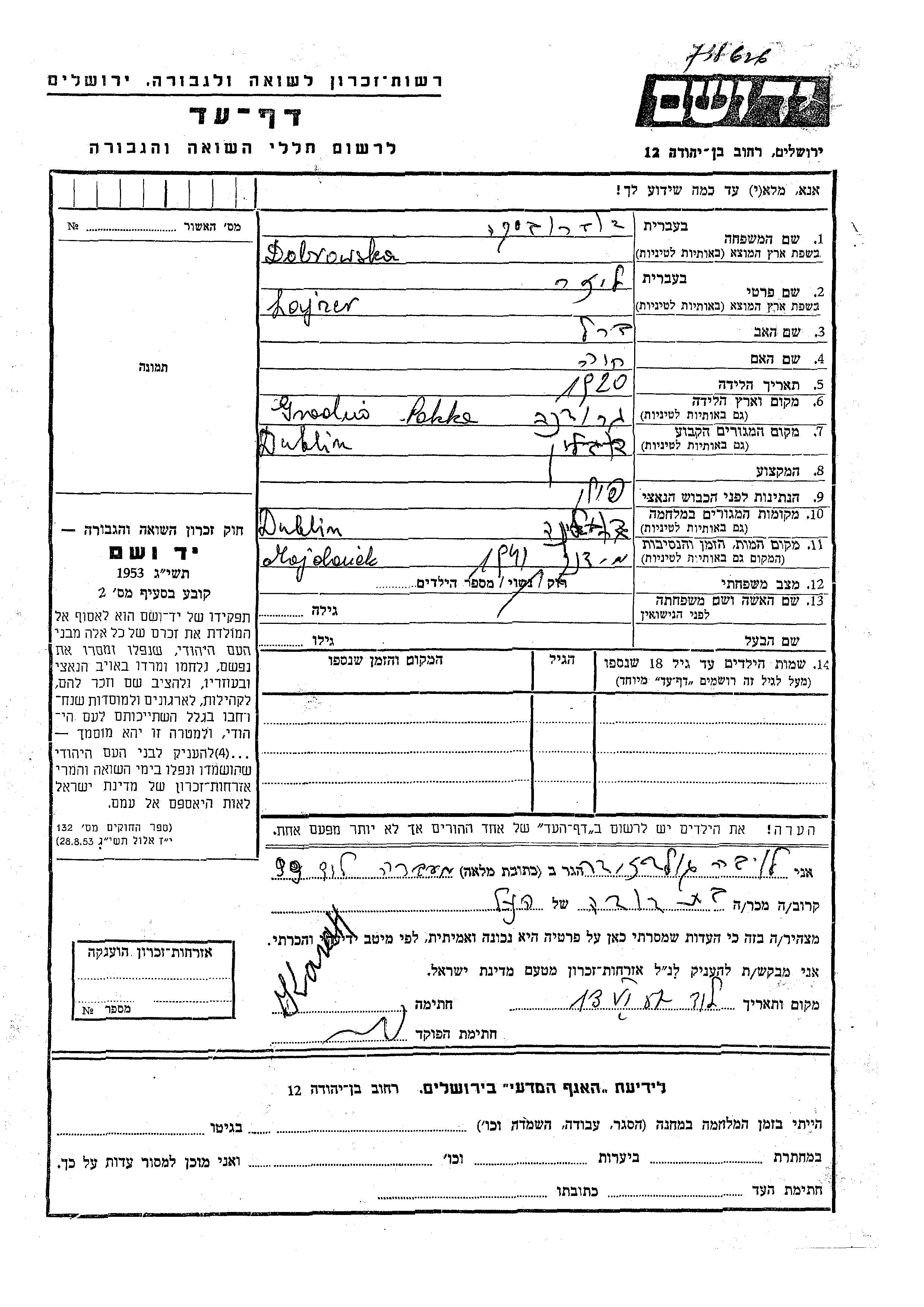 Lajzer Dobrowska wurde im Jahr 1920 in Grodno, Polen geboren. Er war der Sohn von Berl und Khaia. Er war Ledig. Vor dem Zweiten Weltkrieg lebte er in Dublany, Polen. Während des Krieges war er in Dublany, Polen.