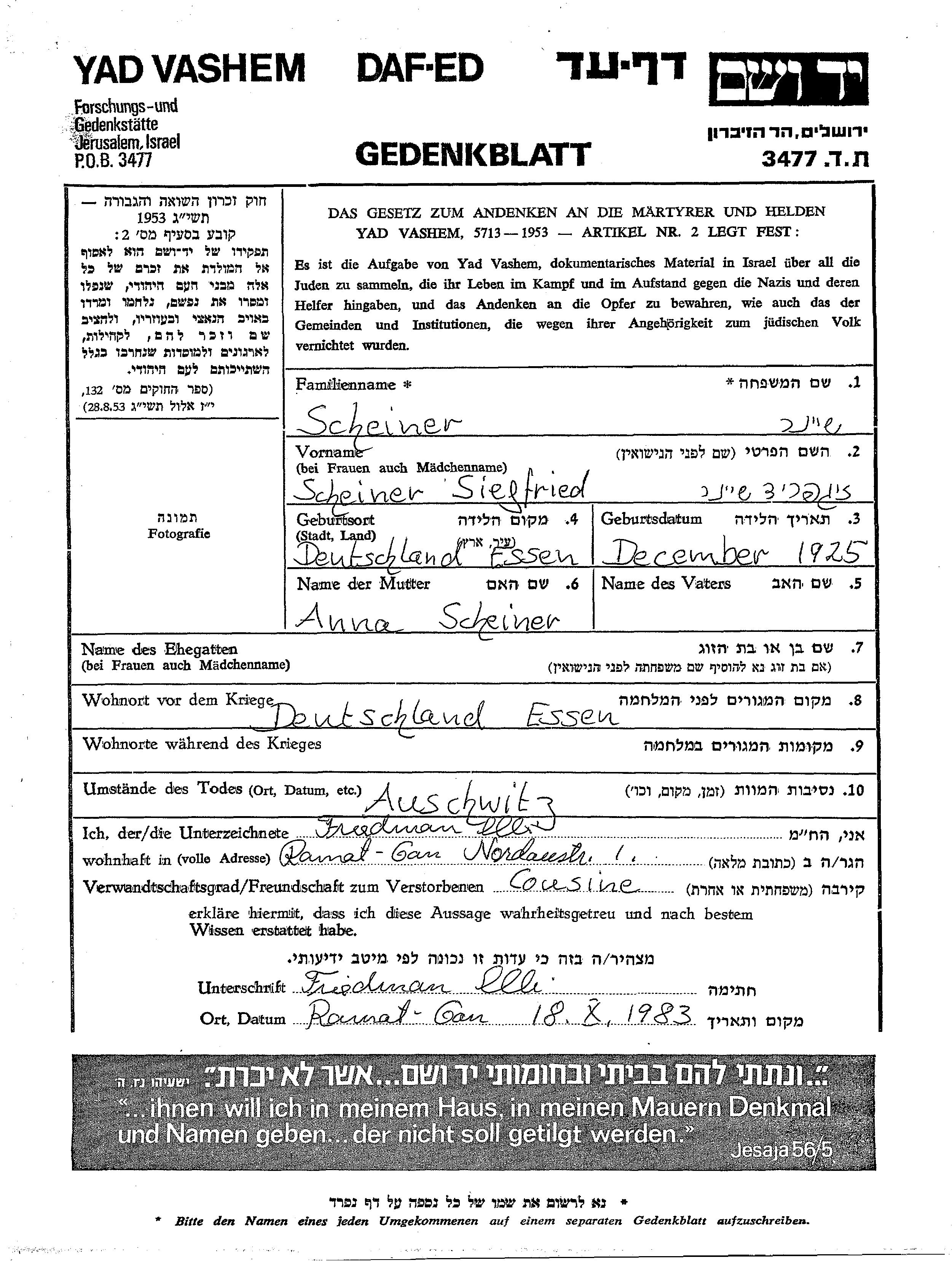 Siegfried Sheiner wurde im Jahr 1925 in Essen, Deutsches Reich geboren. Er war der Sohn von Anna. Vor dem Zweiten Weltkrieg lebte er in Essen, Deutsches Reich.