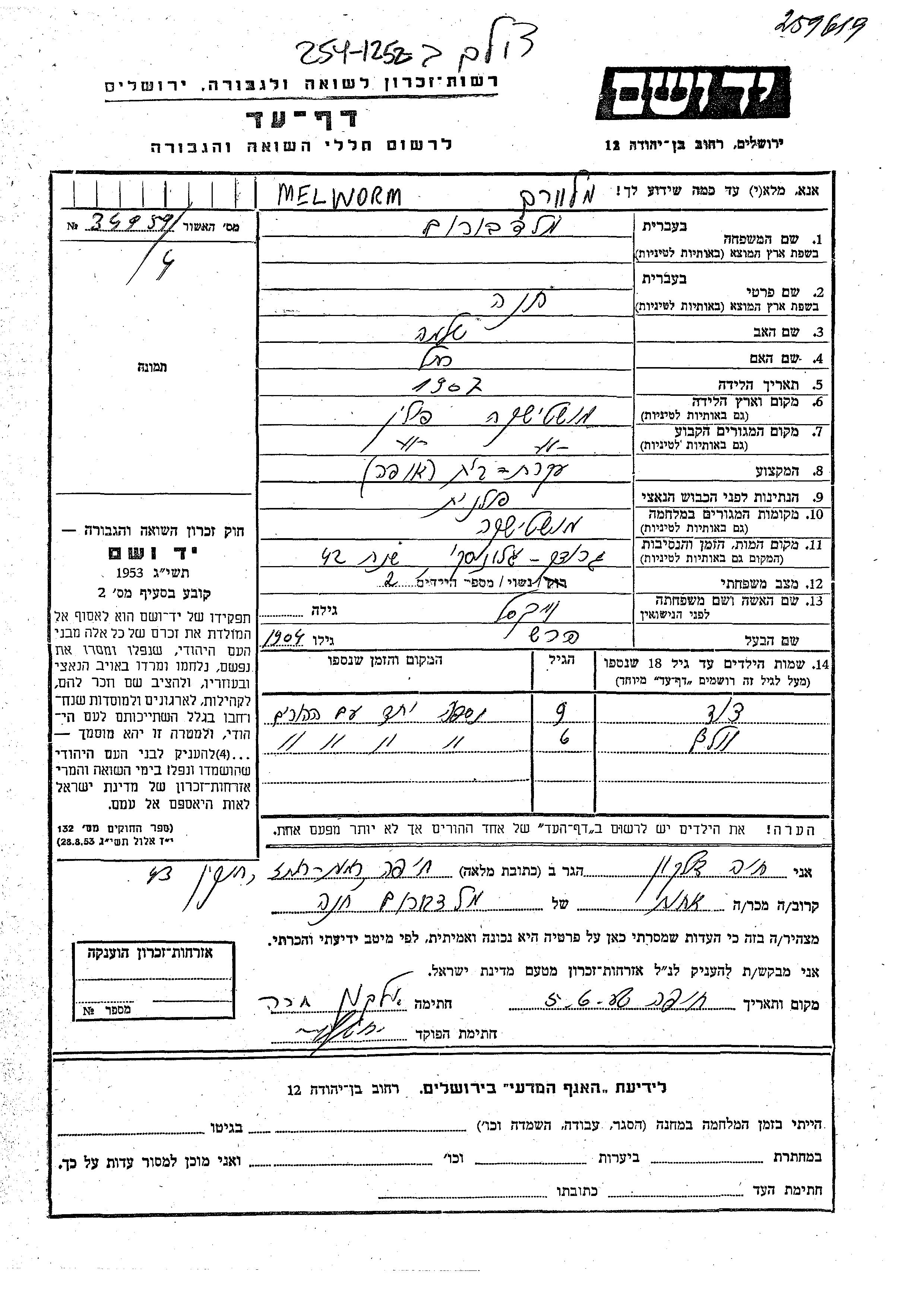 Khana Melworm Mildvorm, geb. Veiksel wurde im Jahr 1907 in Mostiska, Polen geboren. Sie war die Tochter von Shlomo und Rakhel. Sie war Hausfrau und mit Beresh Verheiratet. Vor dem Zweiten Weltkrieg lebte sie in Mostiska, Polen. Während des Krieges war sie in Mostiska, Polen.