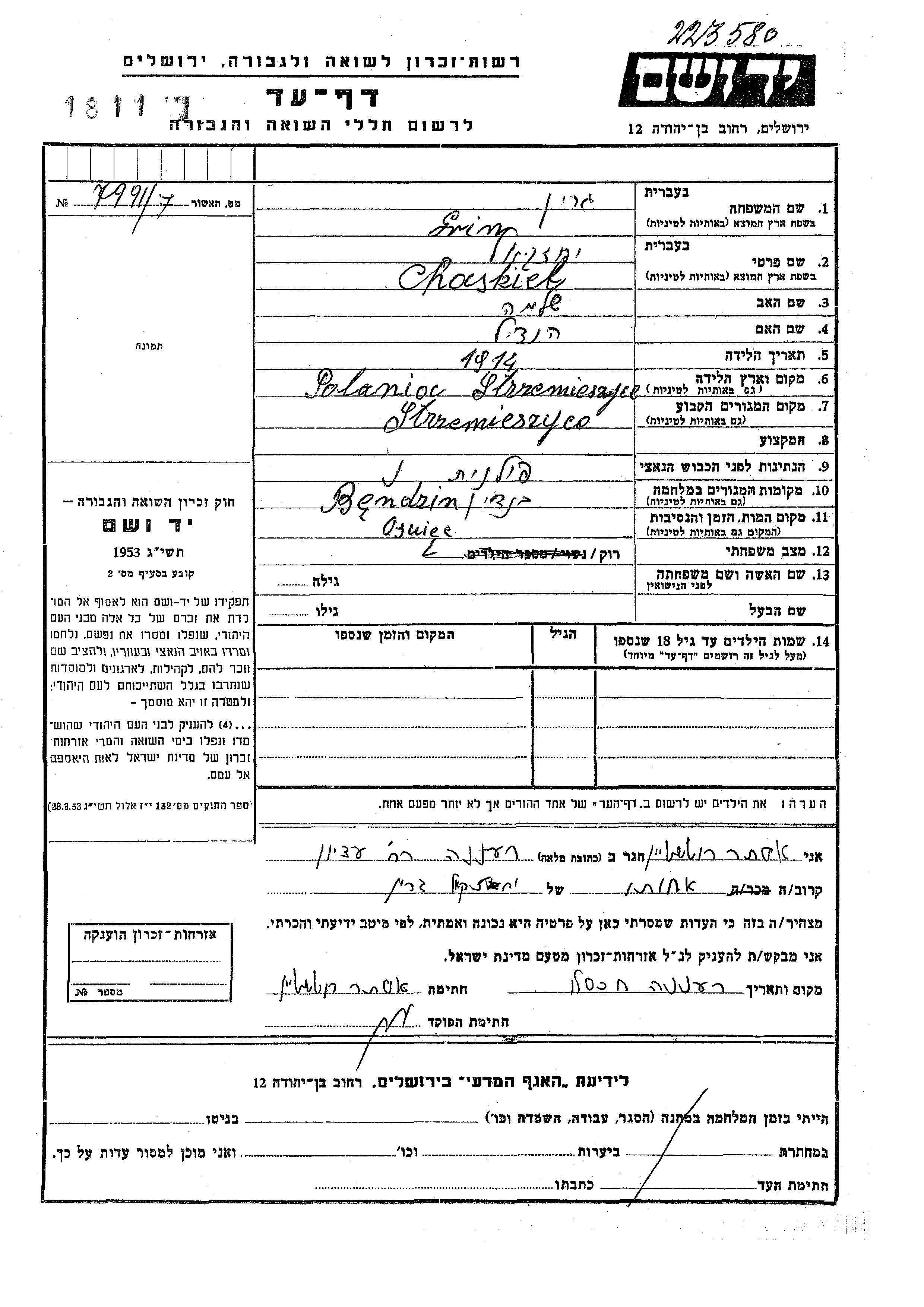 Chaskiel wurde in der Schoah ermordet. Todesort: Auschwitz, Polen.