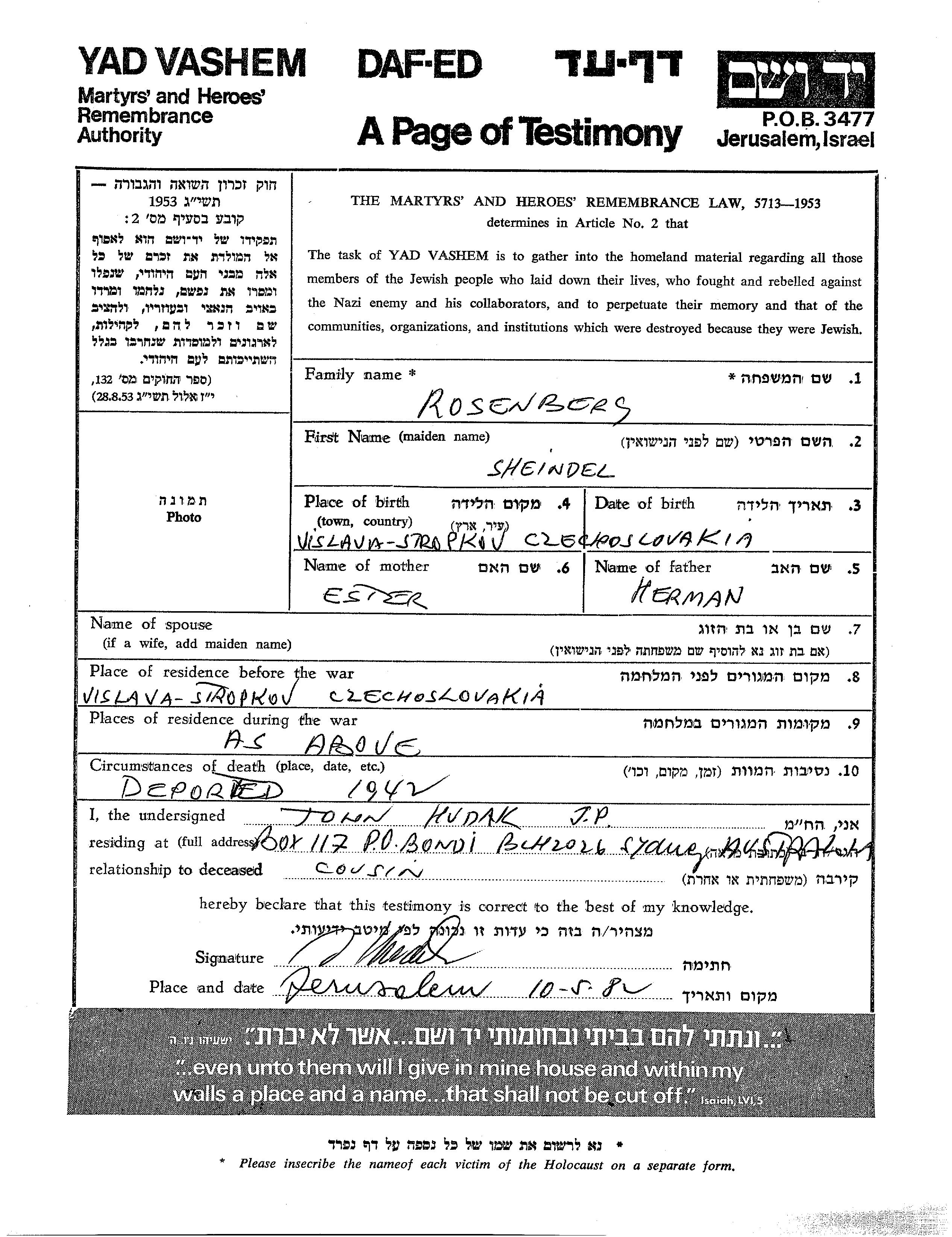 Sheindl Rosenberg wurde in Vislava, Tschechoslowakei geboren. Sie war die Tochter von Herman und Ester. Vor dem Zweiten Weltkrieg lebte sie in Vislava, Tschechoslowakei. Während des Krieges war sie in Vislava, Tschechoslowakei.
