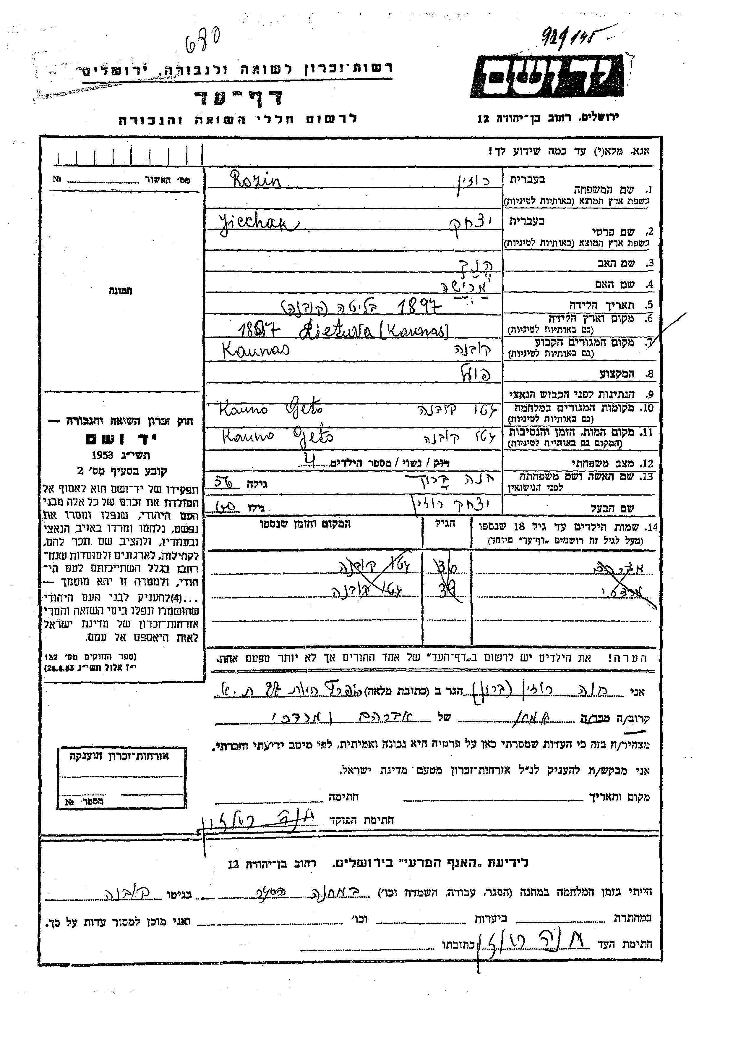 Rozin Yicchak 1897 Kaunas, Litauen Gedenkblatt