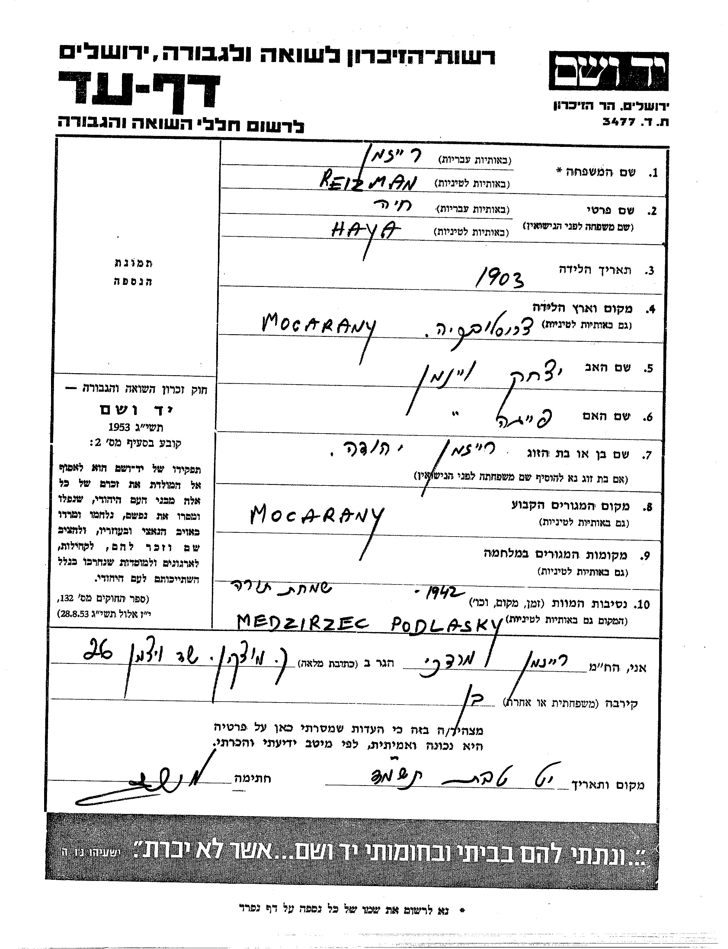 Haya Reizman, geb. Veinman wurde im Jahr 1903 in Mocarany, Tschechoslowakei geboren. Sie war die Tochter von Yitzkhak und Feiga. Sie war mit Yehuda Verheiratet. Vor dem Zweiten Weltkrieg lebte sie in Mocarany, Tschechoslowakei. Während des Krieges war sie in Mocarany, Tschechoslowakei.