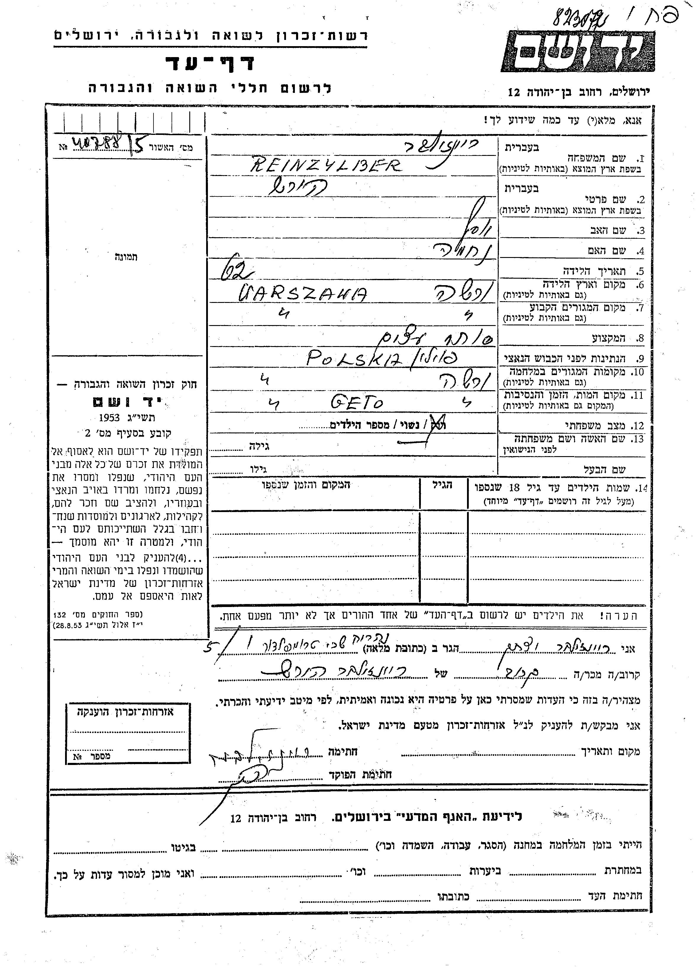 Hirsh Reinzylber wurde in Warsaw, Polen geboren. Er war der Sohn von Yosef und Nekhama. Er war Holzhändler/-in und Verheiratet. Vor dem Zweiten Weltkrieg lebte er in Warsaw, Polen. Während des Krieges war er in Warsaw, Polen.