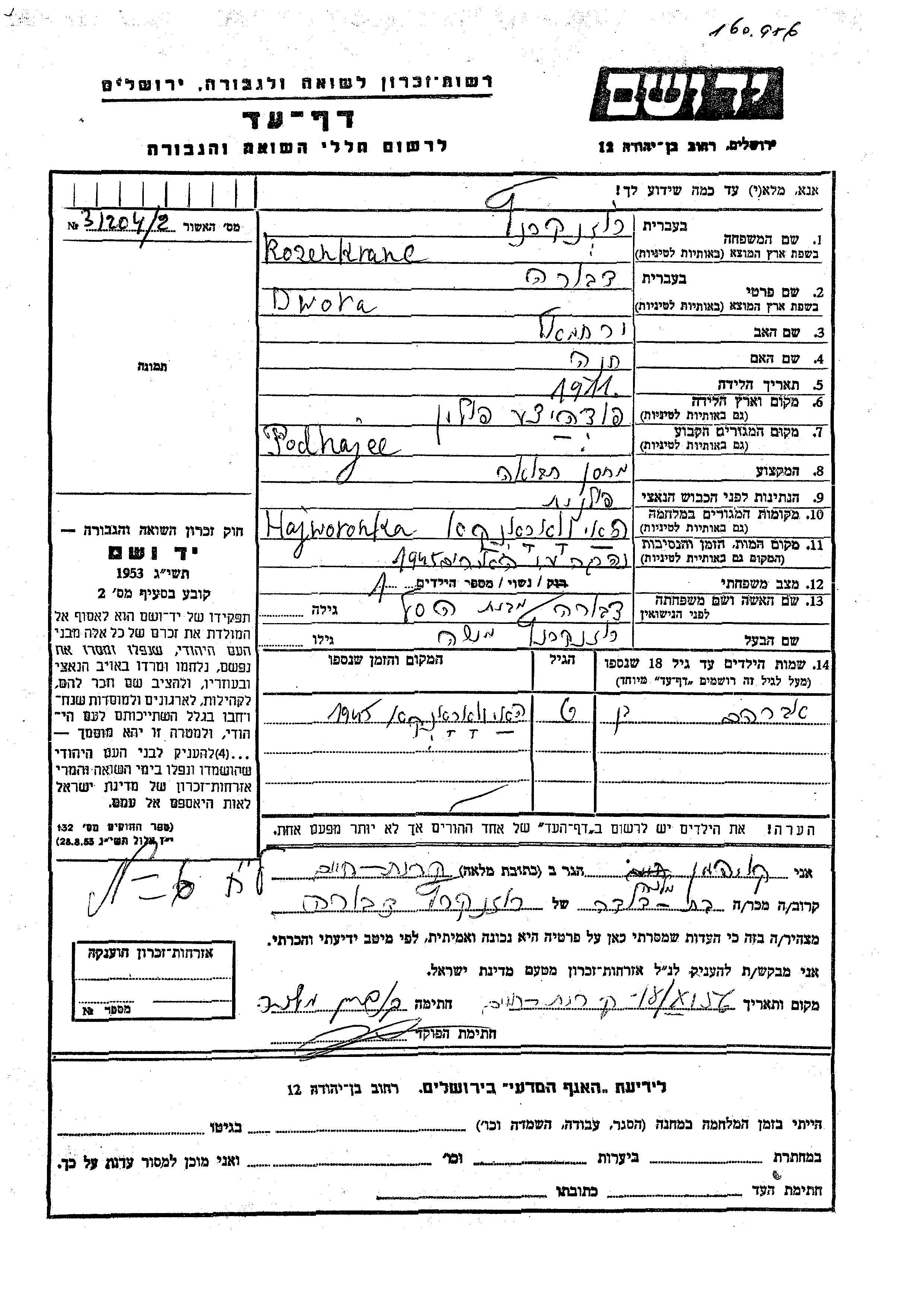 Dwora Rozenkranc, geb. Hesel wurde im Jahr 1911 in Podhajce, Polen geboren. Sie war die Tochter von Yerakhmiel und Khana. Sie war mit Moshe Verheiratet. Vor dem Zweiten Weltkrieg lebte sie in Podhajce, Polen. Während des Krieges war sie in Hajworonka, Polen.