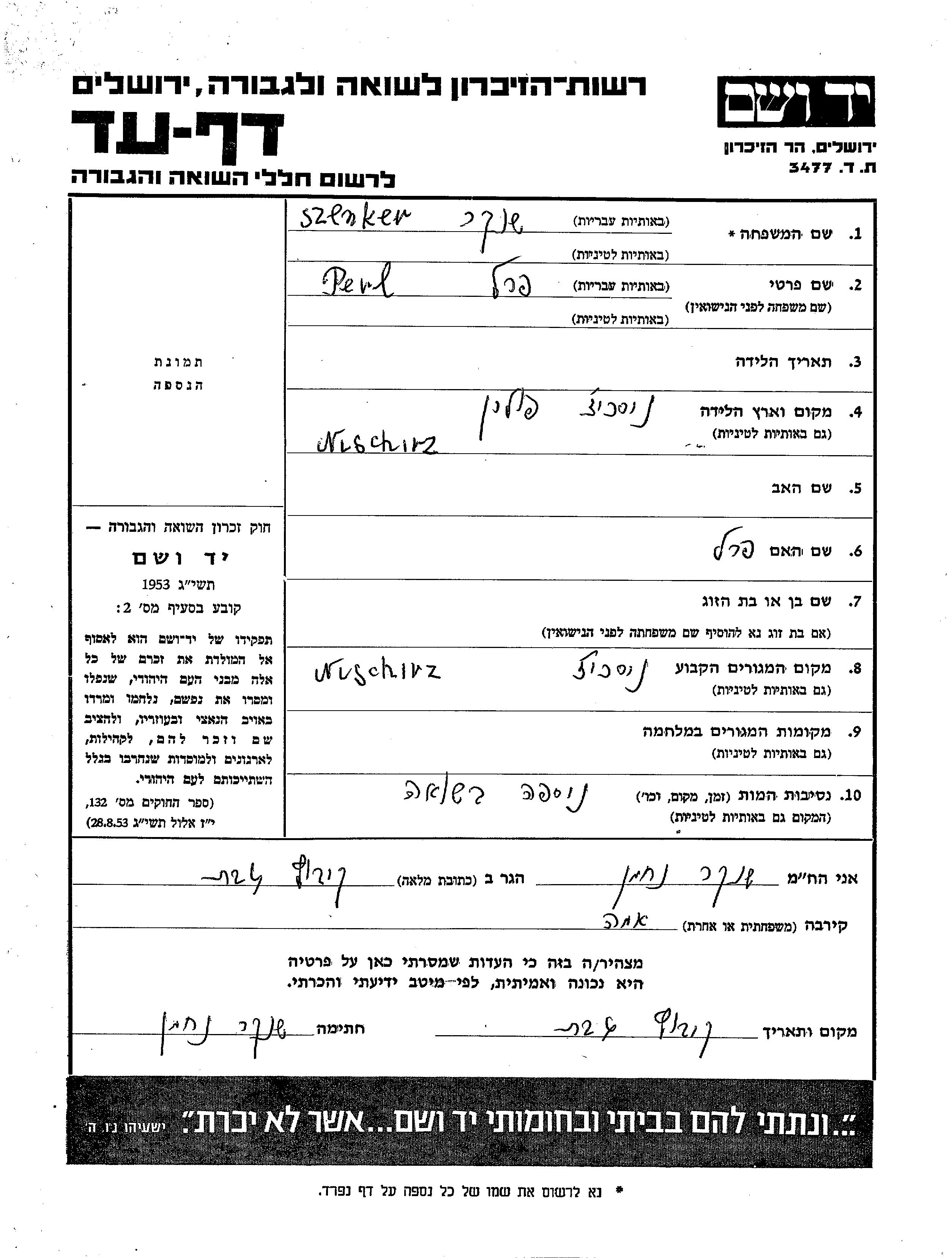 Perl Szenker wurde in Nischirz, Polen geboren. Sie war die Tochter von Perel. Vor dem Zweiten Weltkrieg lebte sie in Nischirz, Polen.
