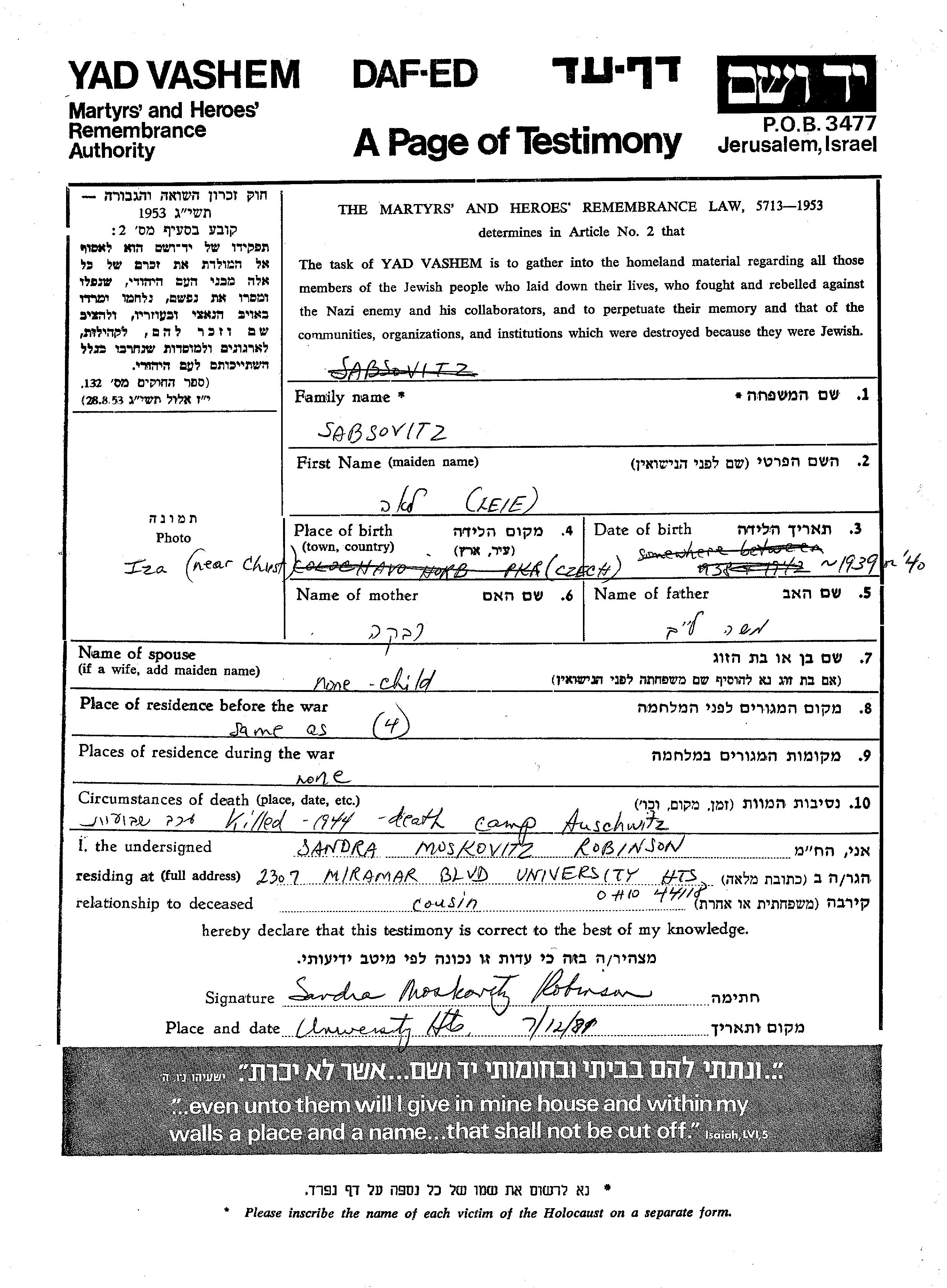Leie Sabsovitz wurde im Jahr 1939 in Iza, Tschechoslowakei geboren. Sie war die Tochter von Moshe Leib und Rivka. Sie war Ledig. Vor dem Zweiten Weltkrieg lebte sie in Iza, Tschechoslowakei.