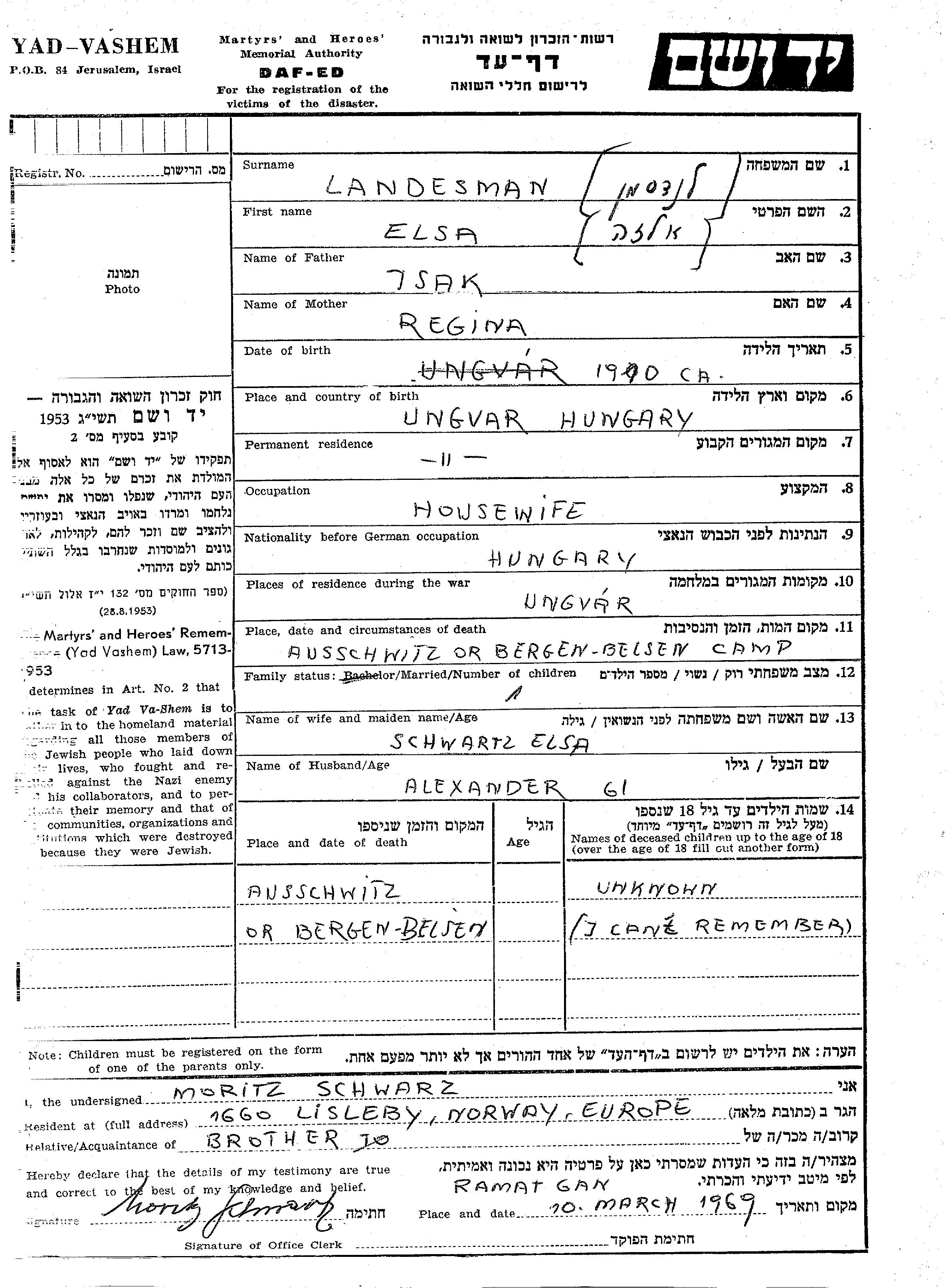 Elsa Landesman, geb. Schwartz wurde im Jahr 1910 in Ungvar, Tschechoslowakei geboren. Sie war die Tochter von Isak und Regina. Sie war Hausfrau und mit Alexander Verheiratet. Vor dem Zweiten Weltkrieg lebte sie in Ungvar, Tschechoslowakei. Während des Krieges war sie in Ungvar, Tschechoslowakei.