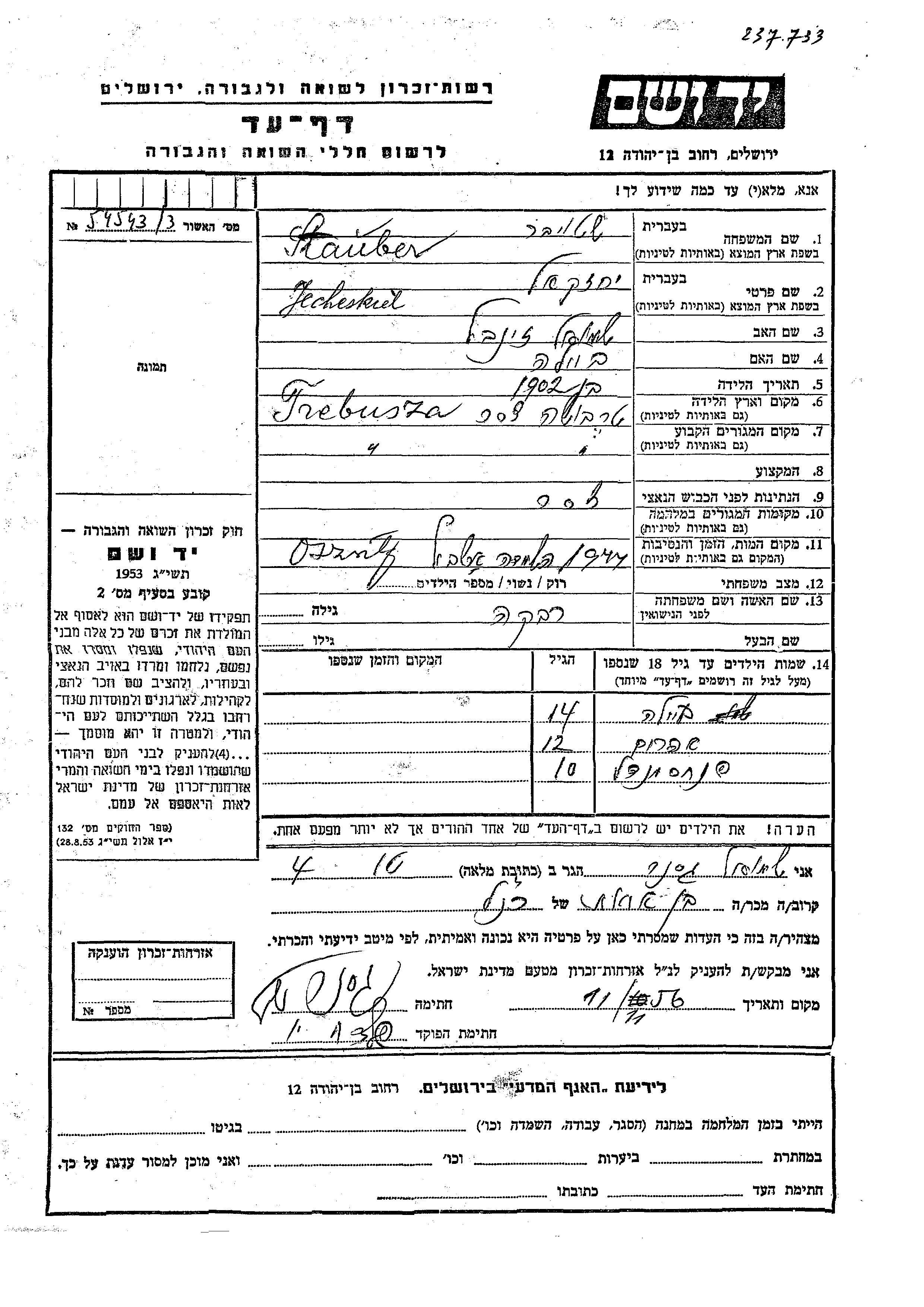 Jecheskiel Stauber wurde im Jahr 1902 in Trebusa, Tschechoslowakei geboren. Er war der Sohn von Shmuel und Beila. Er war mit Rivka Verheiratet. Vor dem Zweiten Weltkrieg lebte er in Trebusa, Tschechoslowakei.