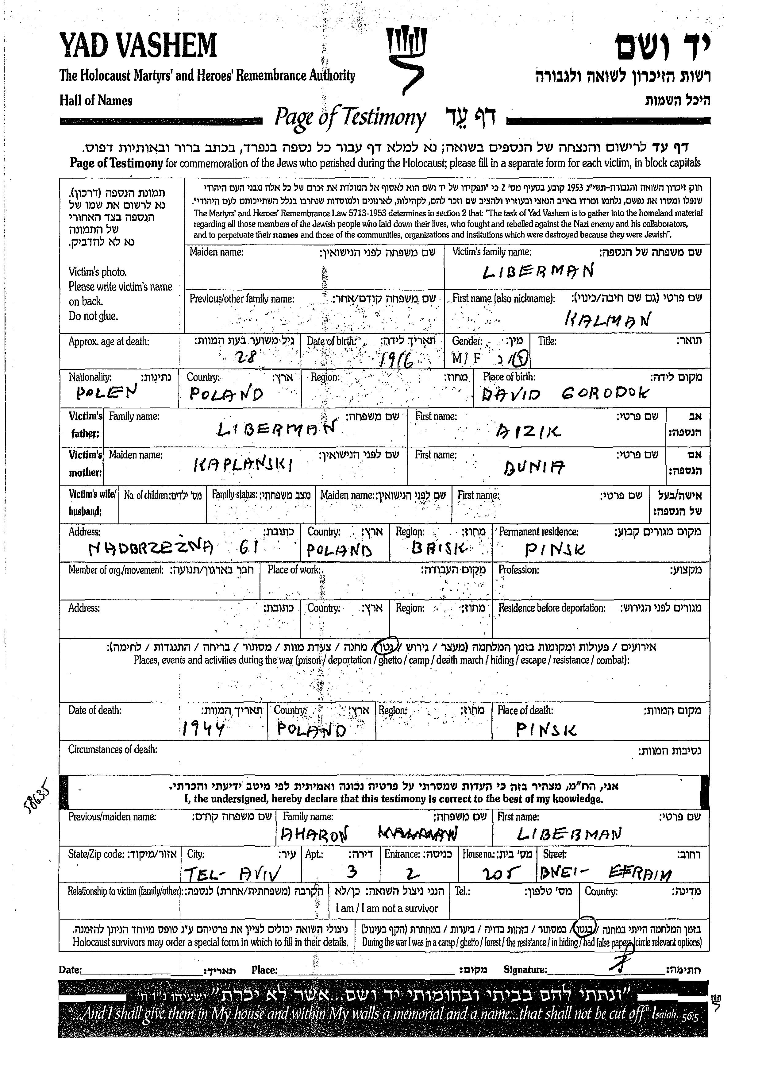 Kalman wurde in der Schoah ermordet. Todesort: Pinsk, Polen im Jahr 1944.