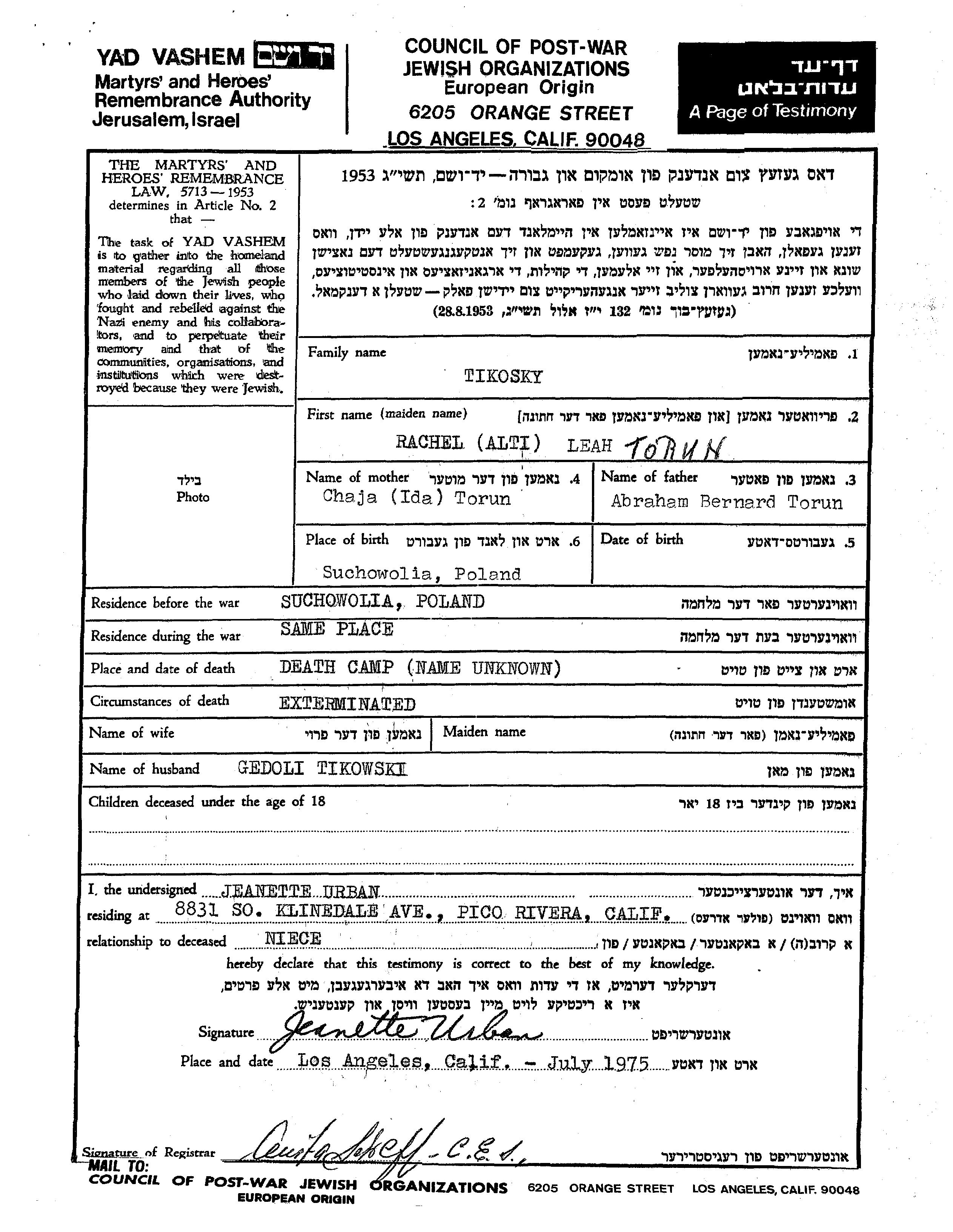 Rachel Alti Leah Tikosky Tikowski, geb. Torun wurde in Suchowola, Polen geboren. Sie war die Tochter von Abraham Bernard und Chaja Ida. Sie war mit Gedoli Verheiratet. Vor dem Zweiten Weltkrieg lebte sie in Suchowola, Polen. Während des Krieges war sie in Suchowola, Polen.