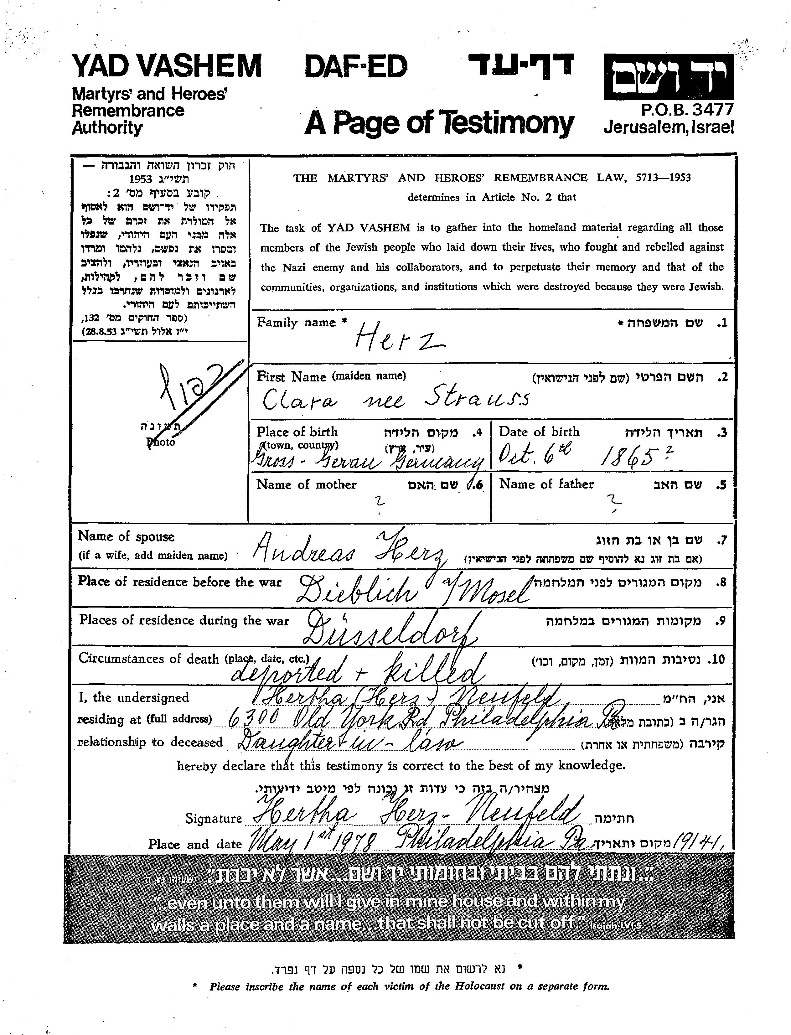 Clara Herz, geb. Strauss wurde im Jahr 1865 in Gross Gerau, Deutsches Reich geboren. Vor dem Zweiten Weltkrieg lebte sie in Dieblich, Deutsches Reich. Während des Krieges war sie in Duesseldorf, Deutsches Reich.