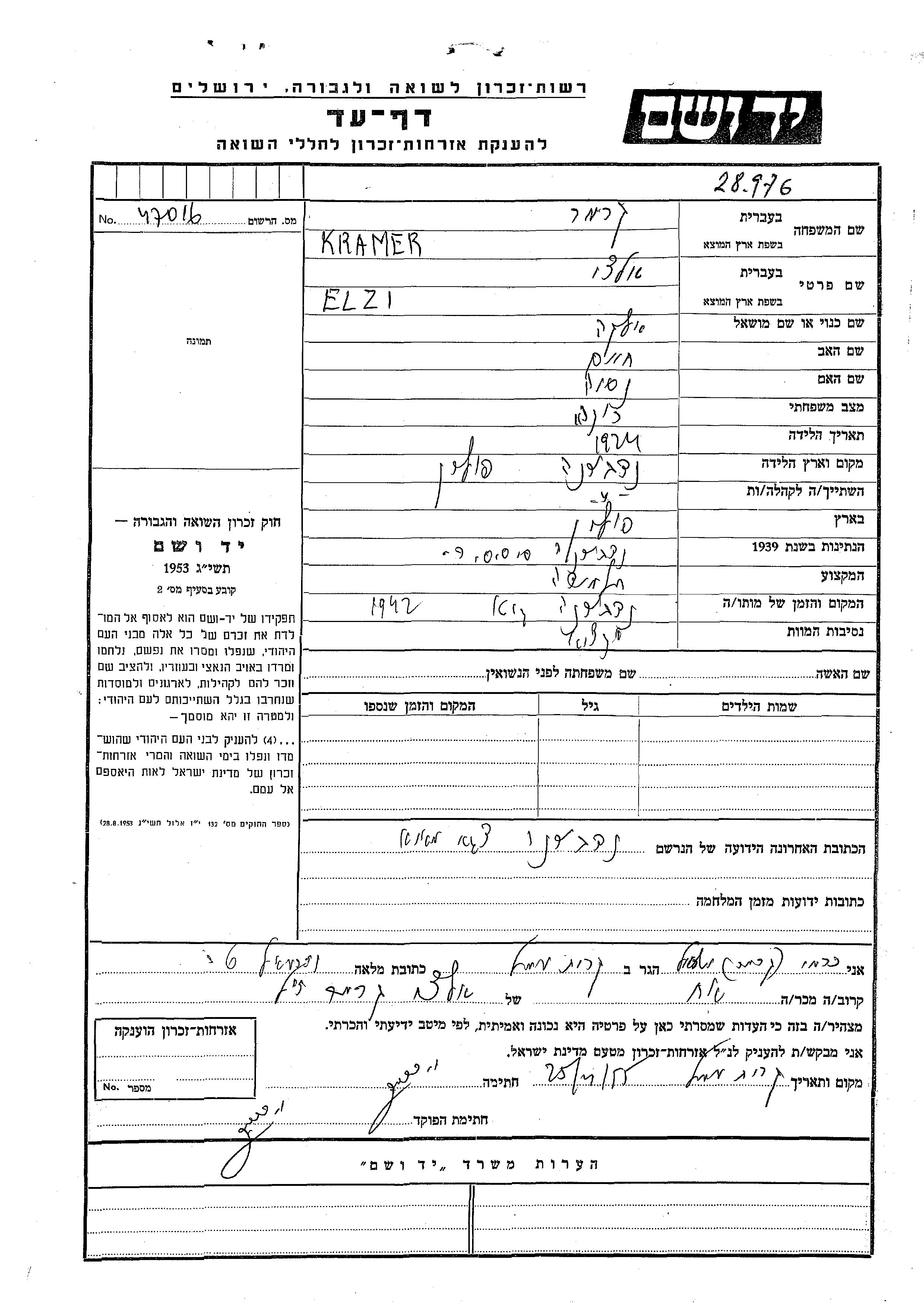 Elzi Eltzi Kramer wurde im Jahr 1924 in Nadworna, Polen geboren. Sie war die Tochter von Khaim und Nesia. Sie war Schüler/-in. Während des Krieges war sie in Nadworna, Polen.